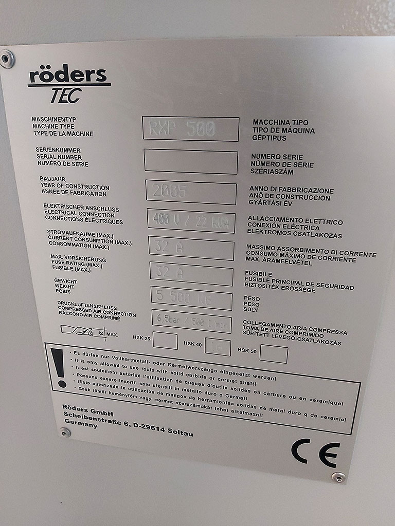 | Description Offered is a Röders RXP 500 high-precision milling machine year 2005, approx. 160763h, spindle approx. 100000h incl. HSK-25 high-frequency spindle with 50000rpm, 42-fold chain magazine, HG sensor, high-accuracy option incl. spindle cooling as well as Renishaw probe, machine weight approx. 5500kg. Viewing is possible by arrangement. |
