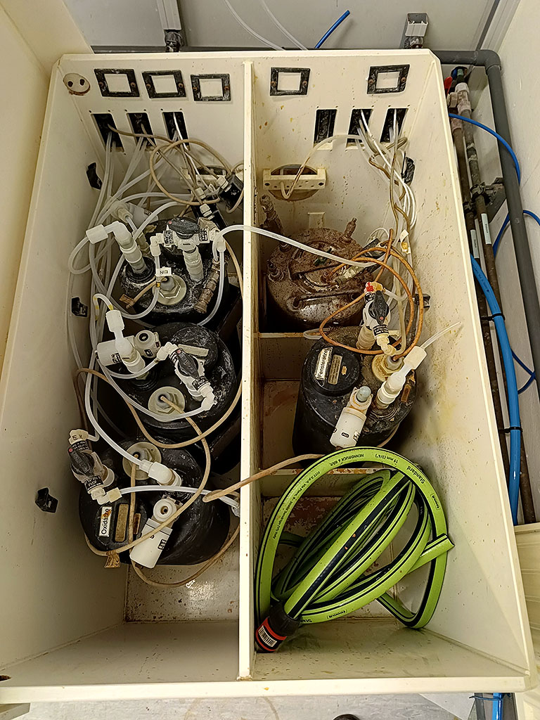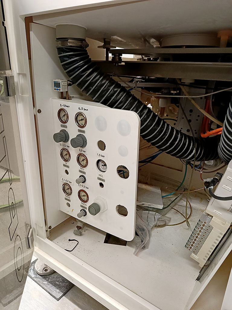 | Description System for wet chemical processing of wafers up to 12in, substrates up to X/Y 9in/9in, stand-alone housing, process modules, PP process chamber, 2 programmable media arms, rotational speed 1-4000rpm, acceleration ramp 1-3000rpm, spin time 1-999s, exhaust process bowl 2x DN110, chamber 2x DN110, housing 1x DN110, control 1x DN110 (each approx. 200m³/h), CDA 8+/-2bar, vacuum -0.8+/-0.2bar, nitrogen 4.0+/-0.5bar, 3 media drains, waste box for 2 concentrate wastes, reagent box with pressure vessel, 4 Julabo thermostat baths. The system was dismantled during disassembly. Viewing possible by arrangement. |