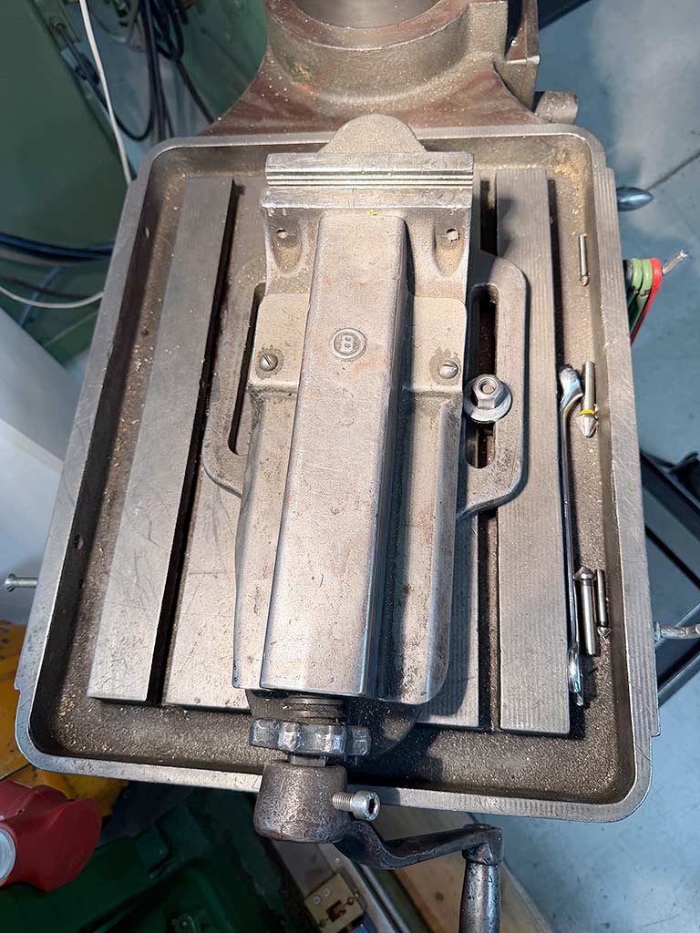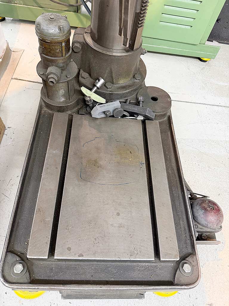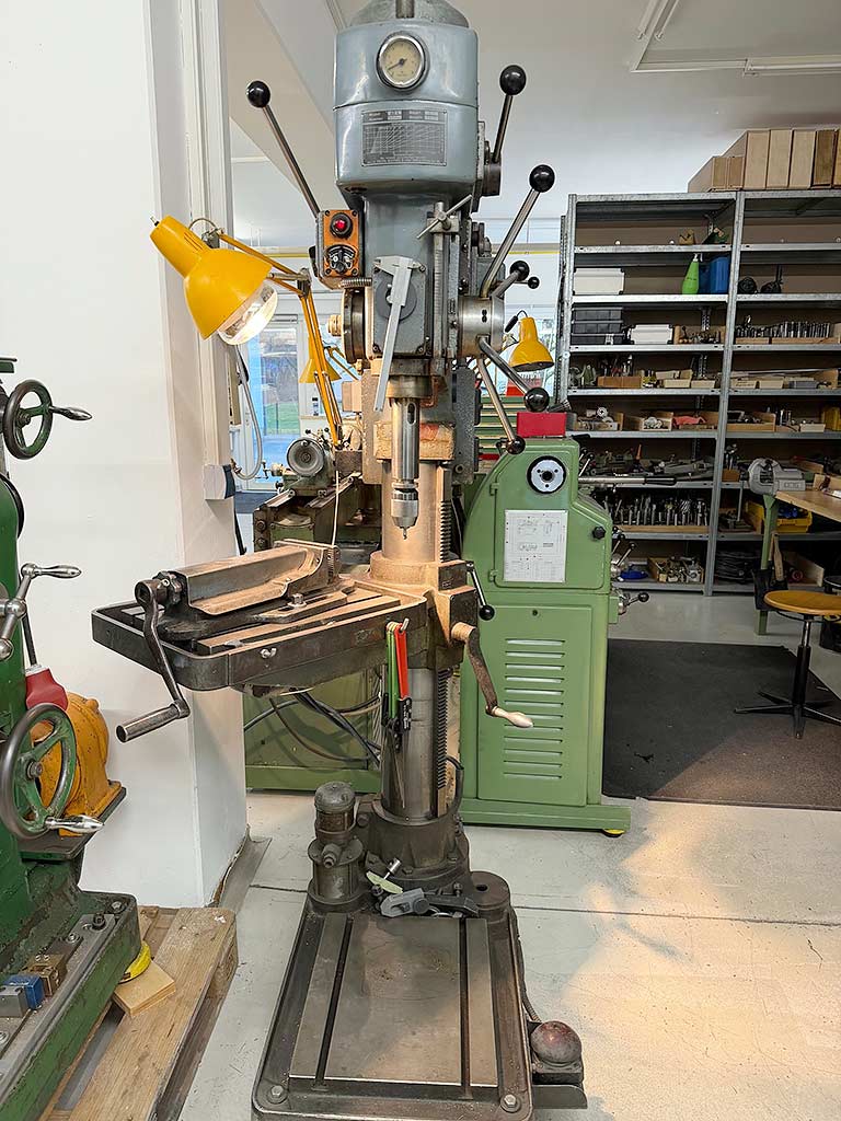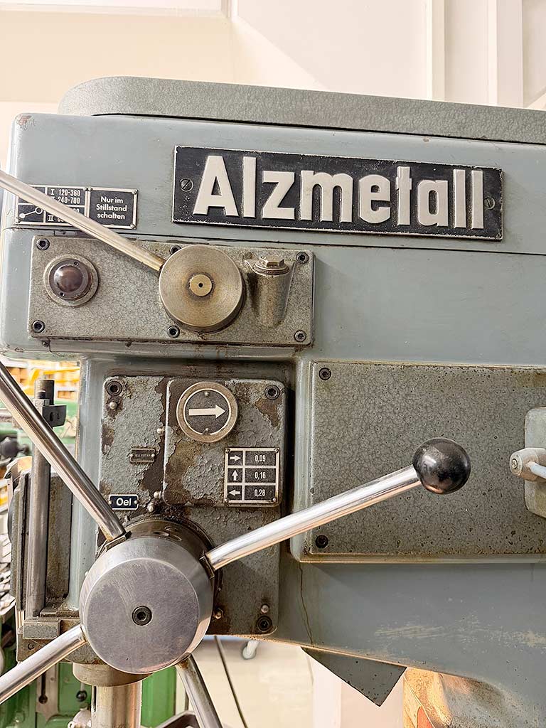 | Description A column drilling machine Alzmetall with a rotating round table is available. Drilling capacity steel/cast iron: 45mm/50mm, reach: 345mm, tool holder: MK4, speed: 720rpm. Machine dimensions X/Y/Z: approx. 1100mm/600mm/2000mm, weight: approx. 650kg. An on-site inspection is possible. |