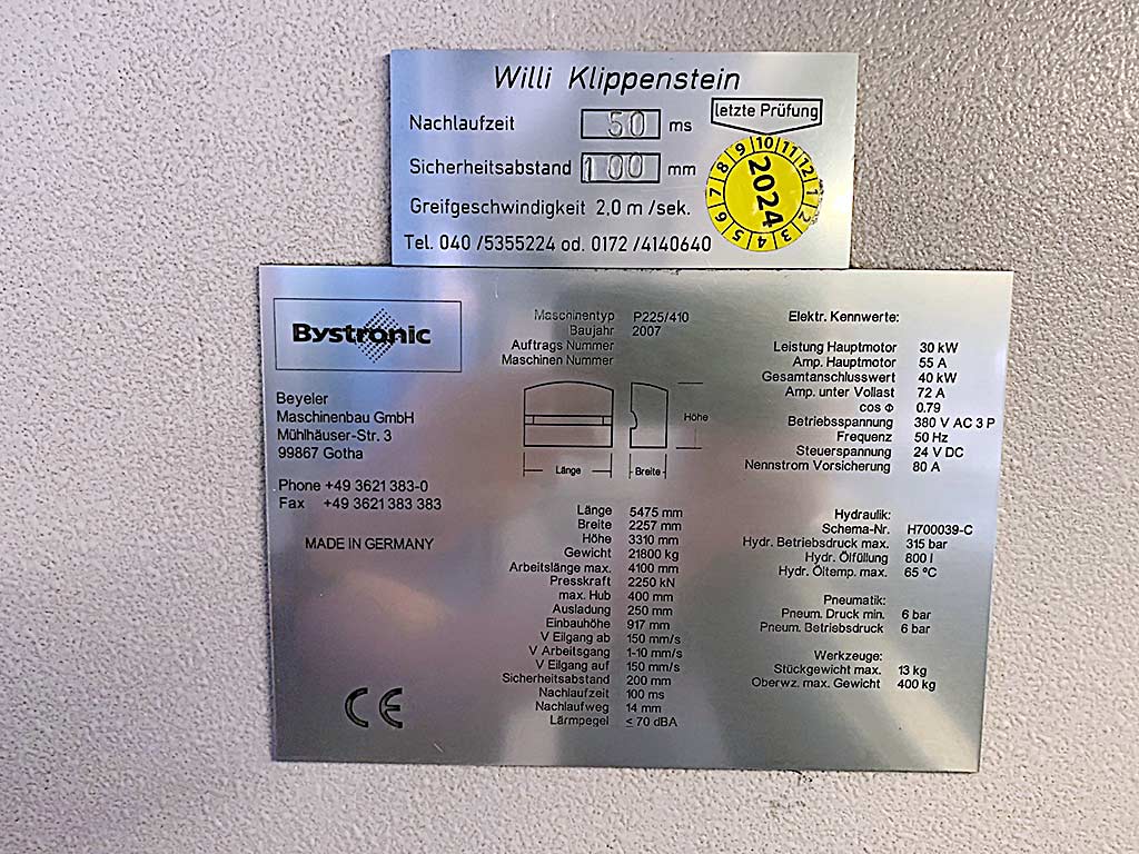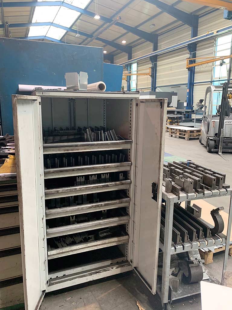 | Description A Beyeler press brake, today Bystronic, is available. Working length: 4100mm, press force: 2250kN, max. stroke: 400mm, throat depth: 250mm, installation height: 917mm, rapid traverse down/up: 150mm/s, working speed: 10mm/s, hydraulic pressure: 315bar, oil volume: 815l, max. oil temperature: 65°C, power: 30kW, max. upper tool weight: 400kg, max. workpiece weight: 13kg. Machine dimensions X/Y/Z: approx. 5500mm/2300mm/3350mm, weight: approx. 22000kg, operating hours: approx. 35000h. Including numerous upper tools, blades and lower tools. Documentation available. On-site inspection is possible. |