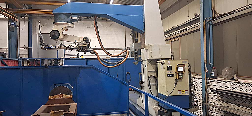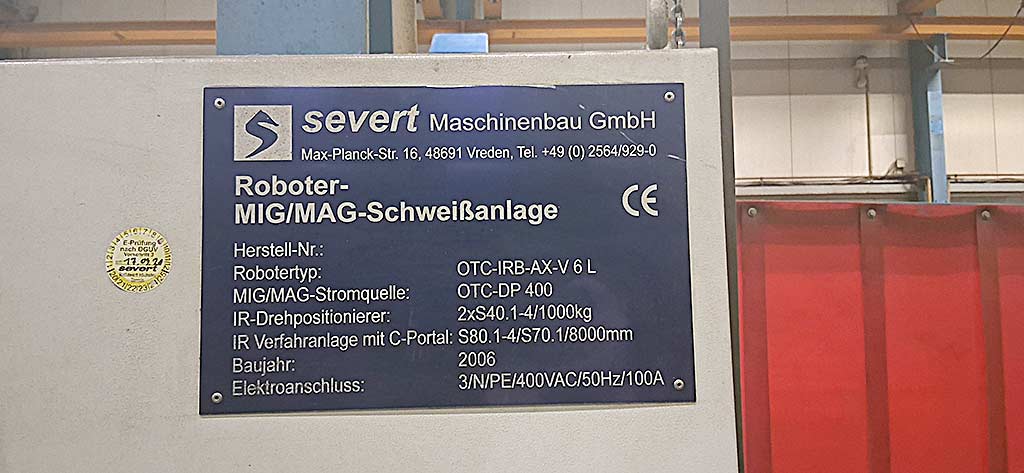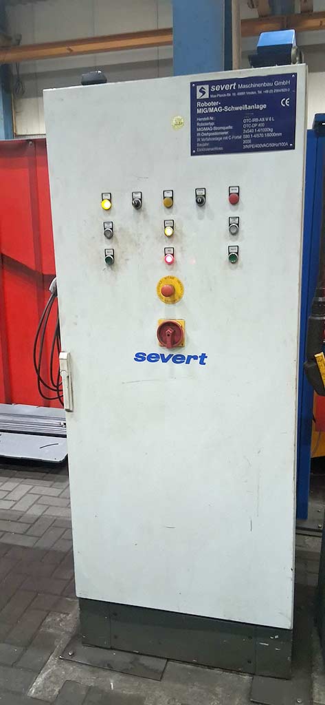 | Description A complete Severt robotic welding system is available. Travel path X: 8000mm, robot axes: 6, stations: 2, axis positioners: 2, positioner speed: 6rpm, positioner load capacity: 1000kg, faceplate torque: 1000Nm, power source: OTC DP 500, power output: 350A. Including seam tracking sensor, push-pull torch, hose packages, wire guide spirals, contact tips, gas nozzles and additional items. Documentation vorhanden. On-site inspection is possible. |