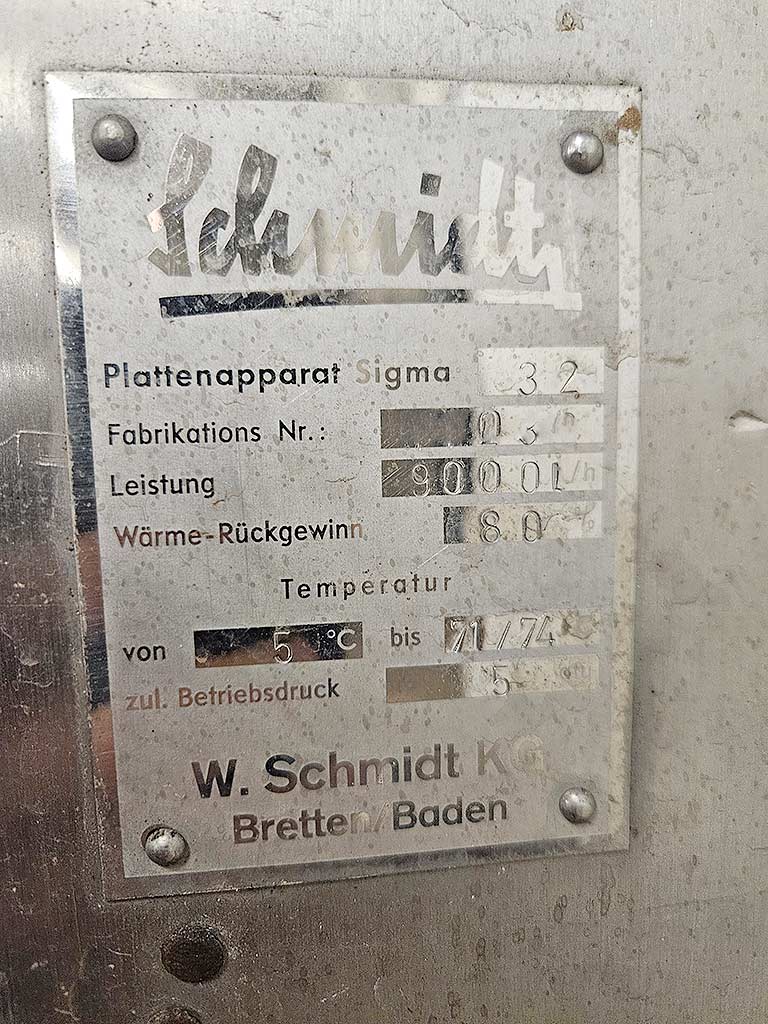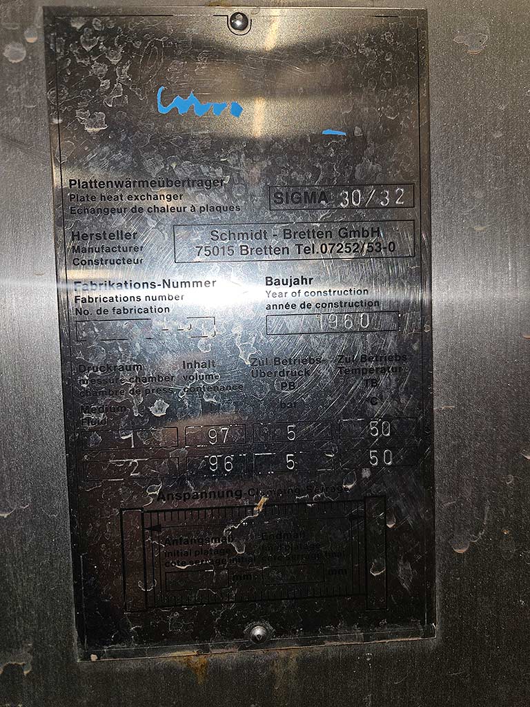 | Description Throughput capacity: 9000l/h, heat recovery: 80%, operating temperature range: 5°C-71°C, max. operating pressure: 5bar, volume: 1/2: 97l/96l. On-site inspection is possible. |