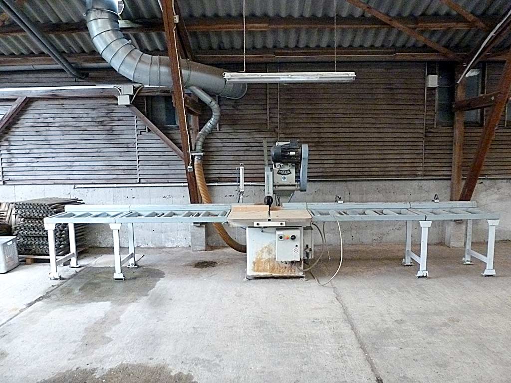 | Description A Stromab pendulum saw with swiveling saw unit and roller conveyors is available. Motor power: 7.5kW, saw blade diameter: 600mm, saw blade bore: 20mm, max. cutting height: 210mm, max. cutting length: 460mm, extraction port diameter: 150mm, roller conveyor length left/right: 2500mm/2500mm, roller conveyor width: 500mm, weight: approx. 600kg. Documentation available. An on-site inspection is possible. |