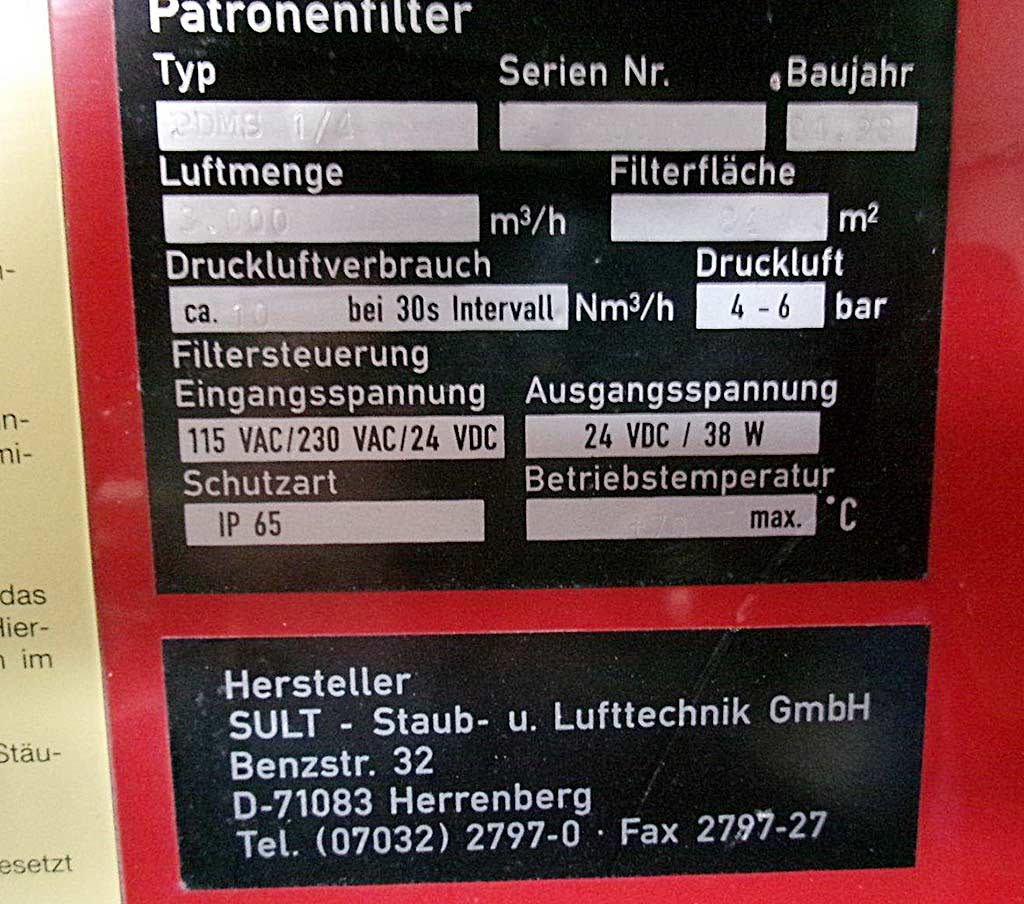 | Description A SULT dust extraction and filtration system with cartridges is available. Air volume flow: 3000m³/h, filter area: 84m², air pressure: 6bar, compressed air consumption: approx. 10Nm³/h, max. operating temperature: 70°C, fan speed: 2980rpm, total pressure drop: 4100Pa, number of cartridges: 4. Machine dimensions X/Y/Z: approx. 2000mm/900mm/5000mm, weight: approx. 1500kg. Documentation available. An on-site inspection is possible. |