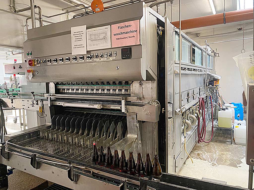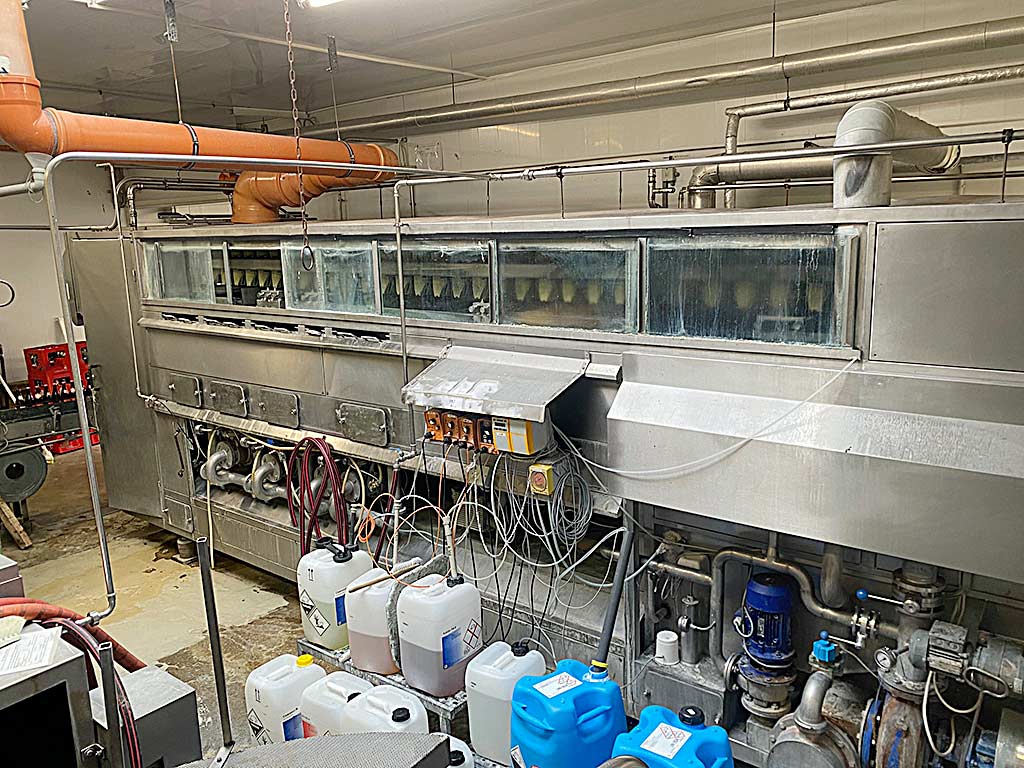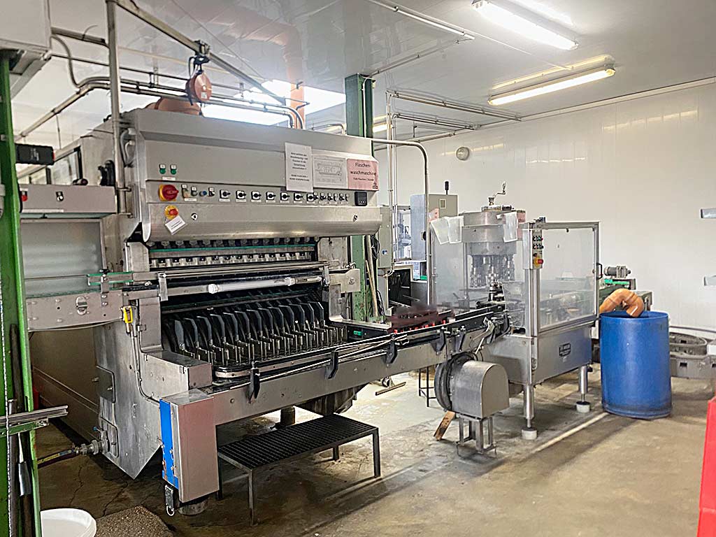 | Description A glass bottle washing machine PAC Swiss is available. Washing capacity: 7500bottles/h, cycle time: 6.72s, throughput time: approx. 12min, bottle types: Euro/NRW/Ale, bottles per row: 14, max. bottles in the machine: 1456, bottle volume: 330ml/500ml, process: preheating/caustic treatment/recooling/spraying, machine dimensions X/Y/Z: approx. 7050mm/1800mm/2300mm, operating hours: approx. 14175h. Documentation available. On-site inspection is possible. |