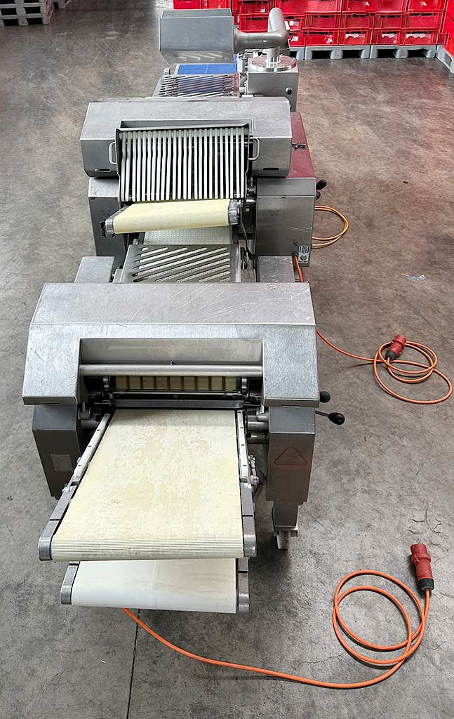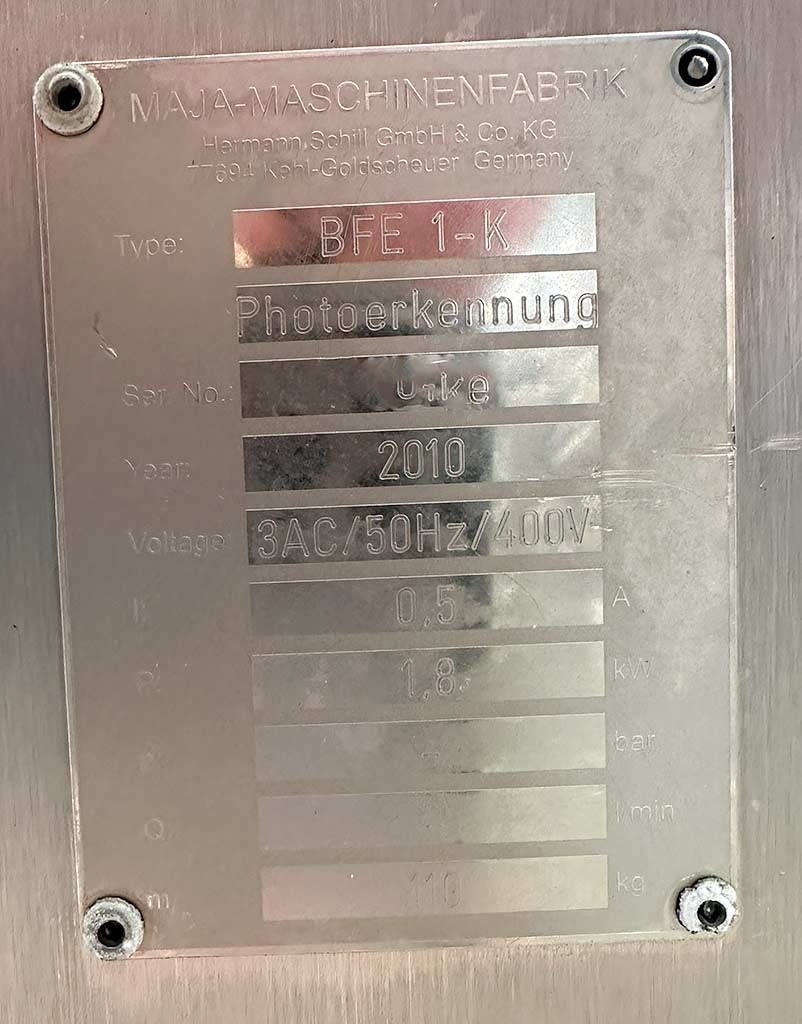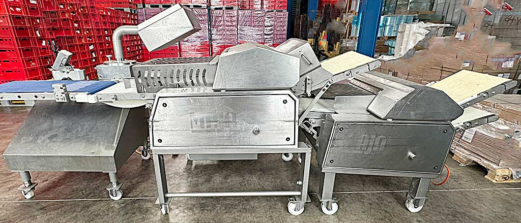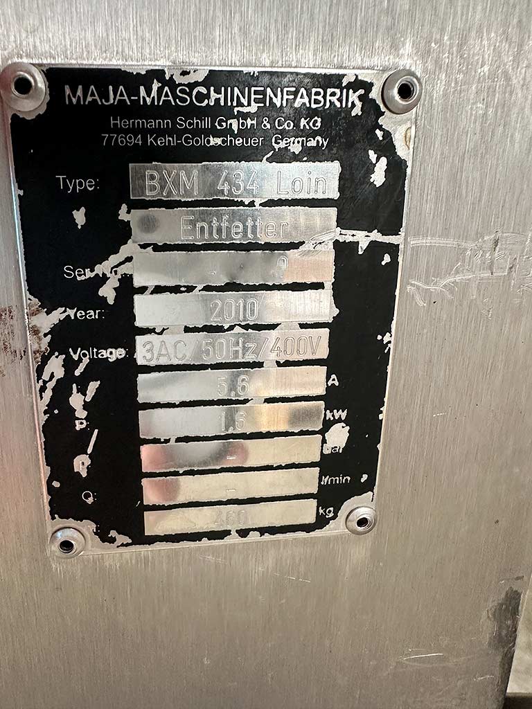 | Description A complete Maja derinding line for chops with defatting machine, derinding machine and photo detection is available. 1) Derinding machine Maja BXA 434, year of manufacture: 2008, cutting width: 434mm, infeed depth: 385mm, clearance and belt width: 443mm, machine dimensions X/Y/Z: approx. 1950mm/1000mm/1250mm, weight: approx. 350kg. 2) Defatting machine Maja BXM 434 Loin, year of manufacture: 2010, max. feed speed: 25m/min, machine dimensions X/Y/Z: approx. 1000mm/900mm/1250mm, weight: approx. 375kg. 3) Fat-lean analysis system Maja BFE 1-K, year of manufacture: 2010. Documentation available. An on-site inspection is possible. |
