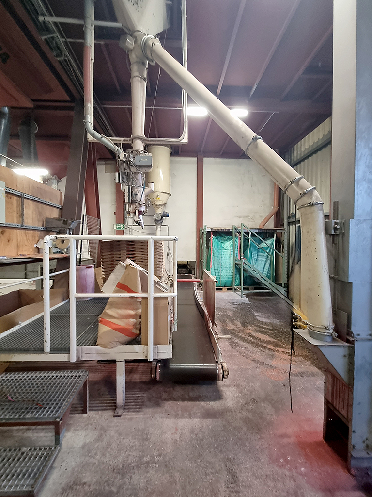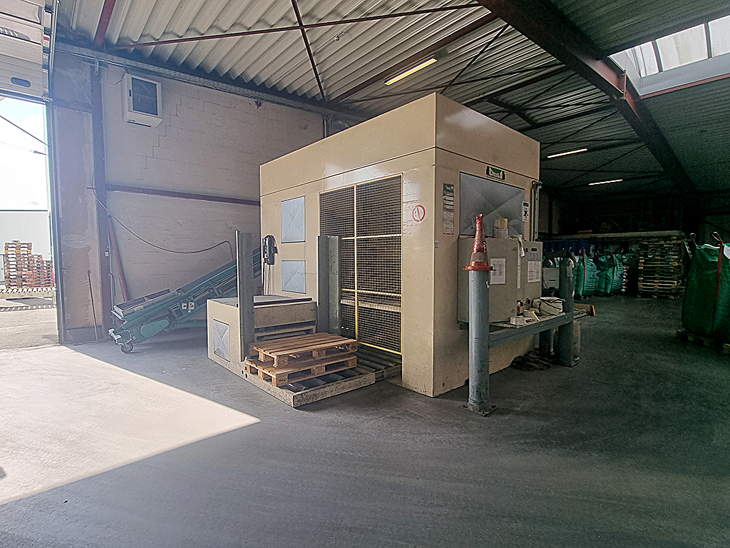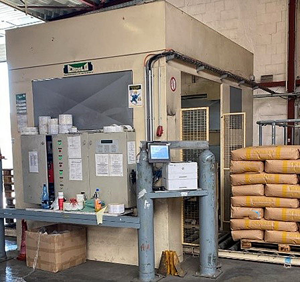 | Description Offered is a valve bag filling system (50kg) with connected palletizer. Bag type: valve bags (paper, PE or PP), filling weight: adjustable up to max. 50kg, piping system with integrated conveying screw / dosing screw, pneumatic bag clamping, weighing unit, discharge conveyor belt. Automatic layer palletizer - Ehcolo PM 400. Year of manufacture: 2001, capacity: up to approx. 400 bags per hour, incline conveyor / bag flattener, empty pallet magazine, complete machine enclosure. Inspection possible by arrangement. |