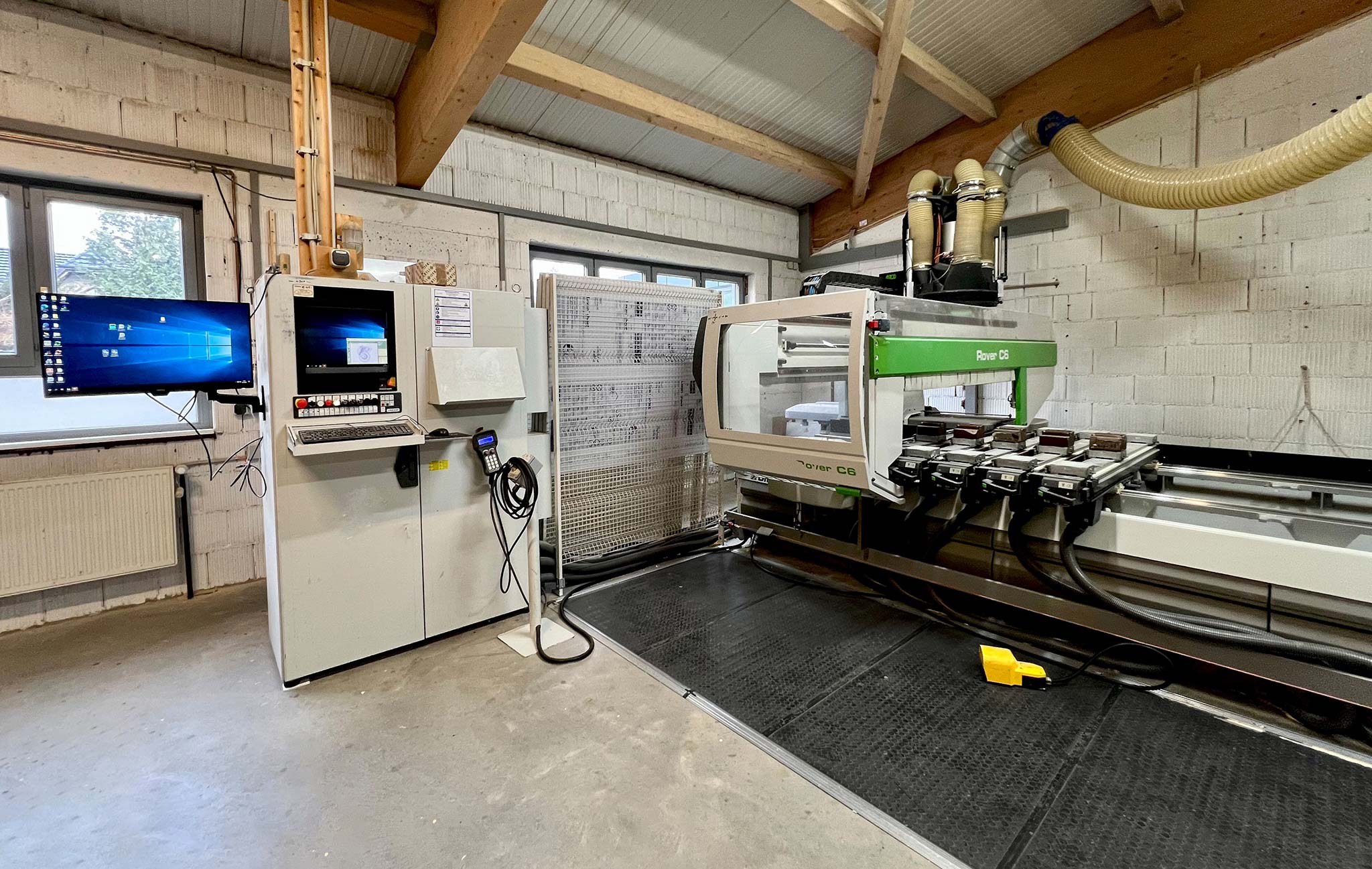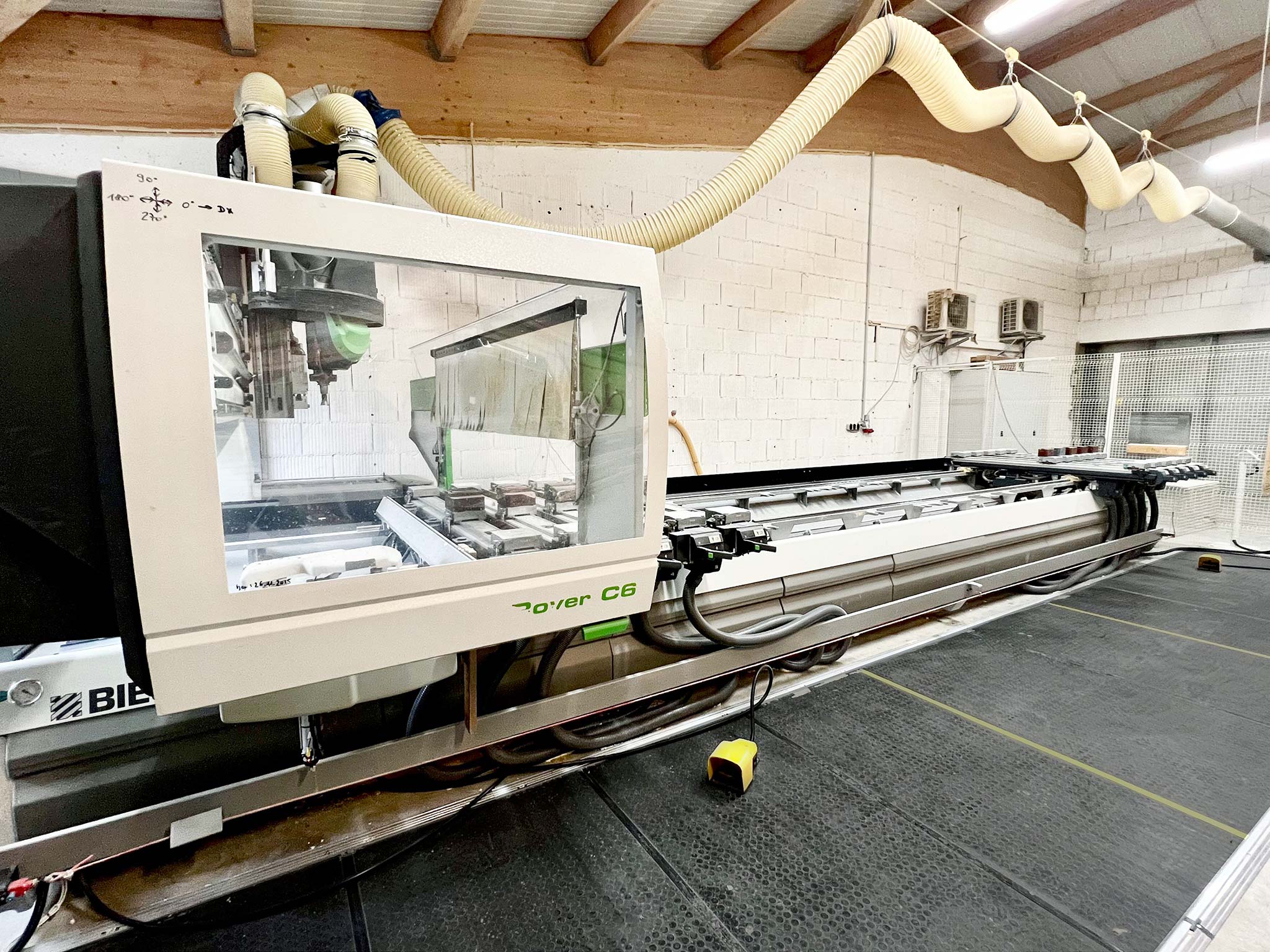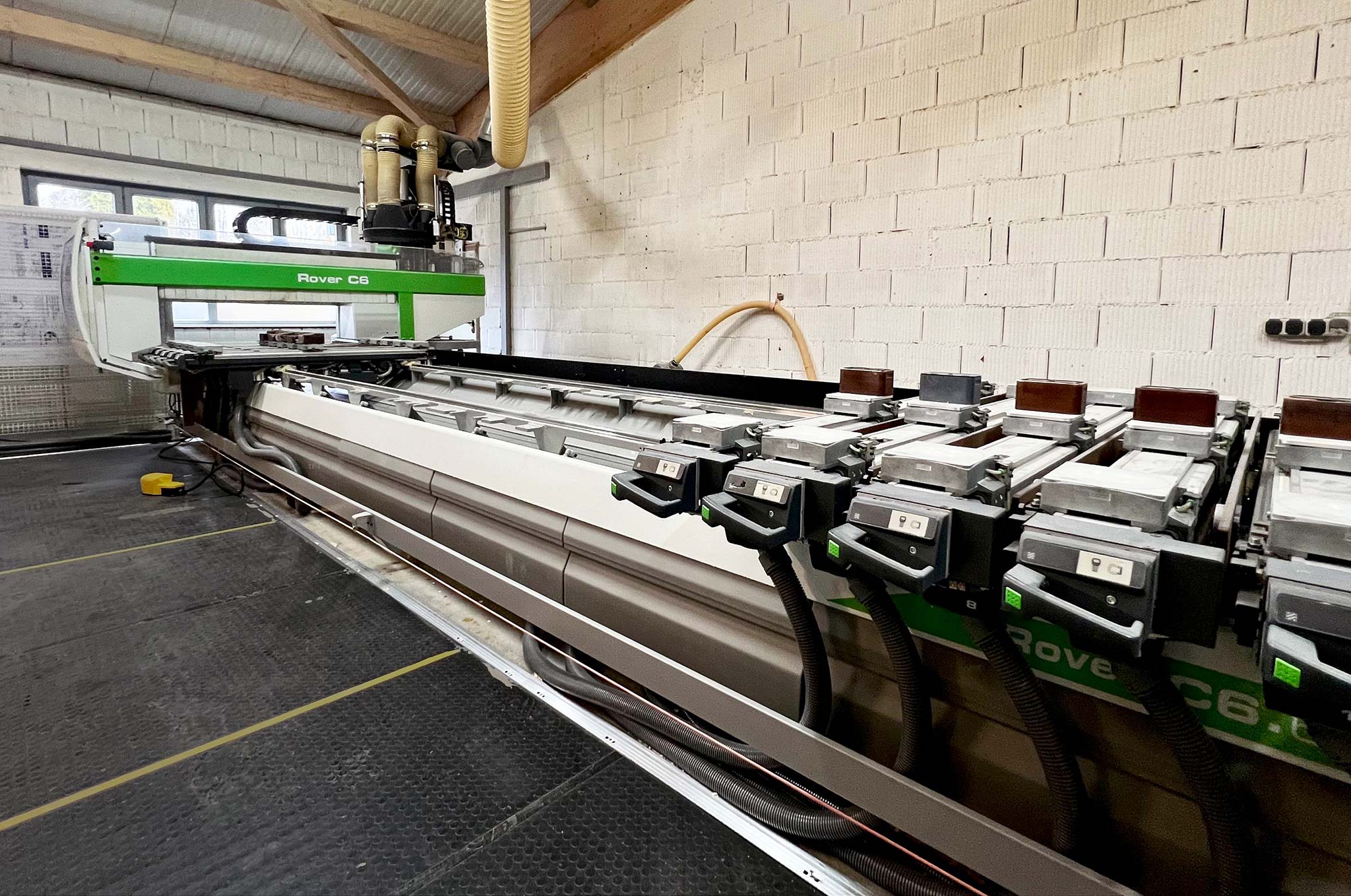 | Description Travel ranges working area 1: X: 6450mm, Y: 1535mm, Z: 250mm, working area 2: X: 6200mm, Y: 1535mm, Z: 250mm, working area 3: X: 6200mm, Y: 1520mm, Z: 275mm, axis travel configuration 1: X: 6820.5mm, Y: 1963mm, Z: 350mm, axis travel configuration 2: X: 6820.5mm, Y: 1963mm, Z: 350mm, axis travel configuration 3: X: 6820.5mm, Y: 1963mm, Z: 663mm (5-axis head), Z: 350mm (additional machining units), control: Biesse XP600. Maintenance: complete C-axis was replaced in 2015 including accessories, vacuum pump was fully replaced in 2016 including bellows, hoses and additional components, in 2021 the machine was equipped with a new high-performance control PC running a current Windows 10 operating system. With extensive documentation. An on-site inspection is possible. |