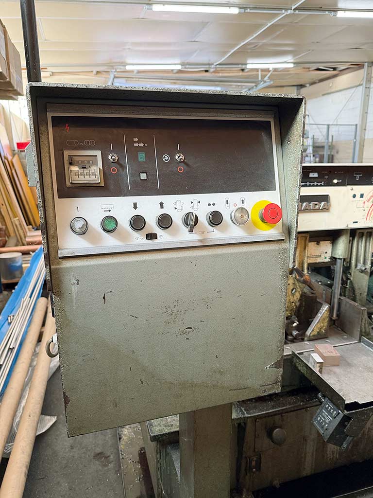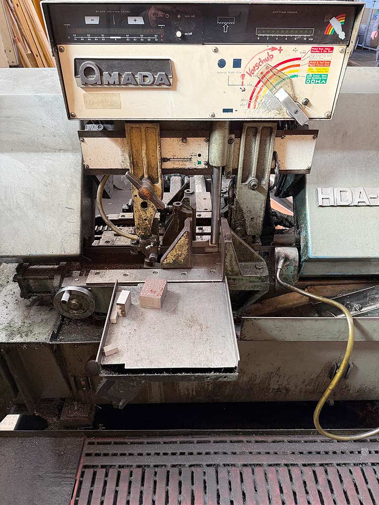 | Description A fully automatic hydraulic horizontal band saw Amada in scissor design is available. Round cutting capacity: 254mm, rectangular cutting capacity: 254mm/279mm, saw band dimensions X/Y/Z: 3505mm/27mm/0.9mm, speed: 80m/min, feed: 390mm/stroke, max. cutting length: 3500mm, max. table load: 1000kg. Machine dimensions X/Y/Z: approx. 2250mm/2000mm/1500mm, weight: approx. 1250kg. An on-site inspection is possible. |