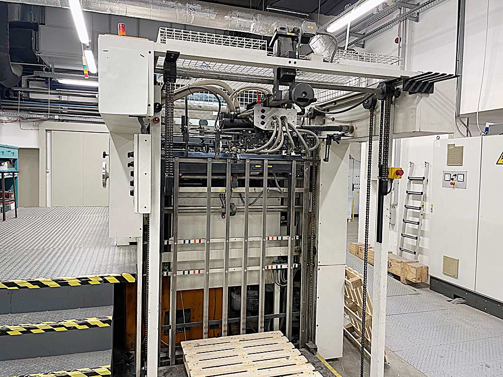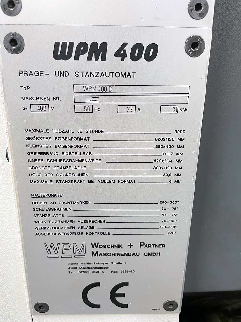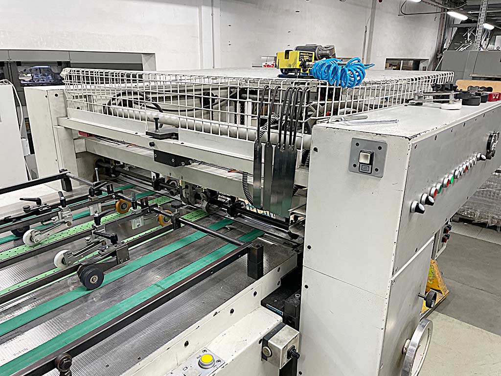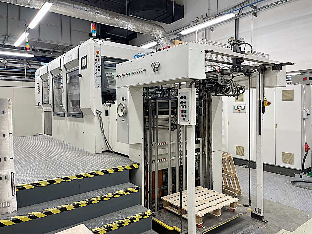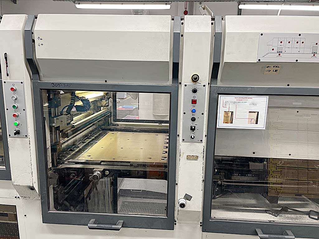 | Description A die-cutting and embossing machine Woschnik + Partner is available. Stroke rate: 9000/h, max. sheet dimensions X/Y: 820mm/1130mm, min. sheet dimensions X/Y: 360mm/400mm, gripper margin adjustment: 10mm-17mm, closing frame dimensions X/Y: 820mm/1134mm, max. die-cutting dimensions X/Y: 800mm/1120mm, cutting rule height: 23.8mm, max. punching force: 4000kN. Machine dimensions X/Y/Z: approx. 8000mm/2650mm/2950mm, weight: approx. 30000kg. Documentation available. An on-site inspection is possible. |