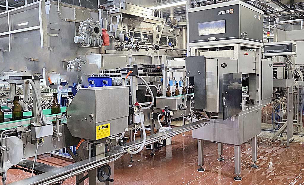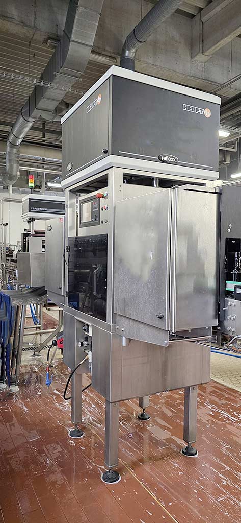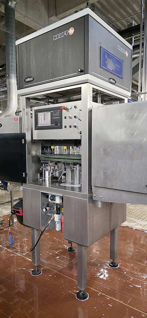| Description An empty bottle inspection machine Heuft including a pre-sorting unit Heuft Spectrum SX TB 72 and Gateway II is available. Inspector: rated throughput: 72000bottles/h, bottle types: Ale/NRW/Euro/Krombacher swing top/swing top, bottle colors: green/brown/clear, closure types: crown cap/screw cap/embossing, bottle volume: 330ml/500ml, pre-sorting: bottle type/bottle height, inspection types: sidewall/finish/thread/base/residual liquid/labels/test bottles. Including defective bottle reject systems and infeed and outfeed conveyor. Documentation available. An on-site inspection is possible. |