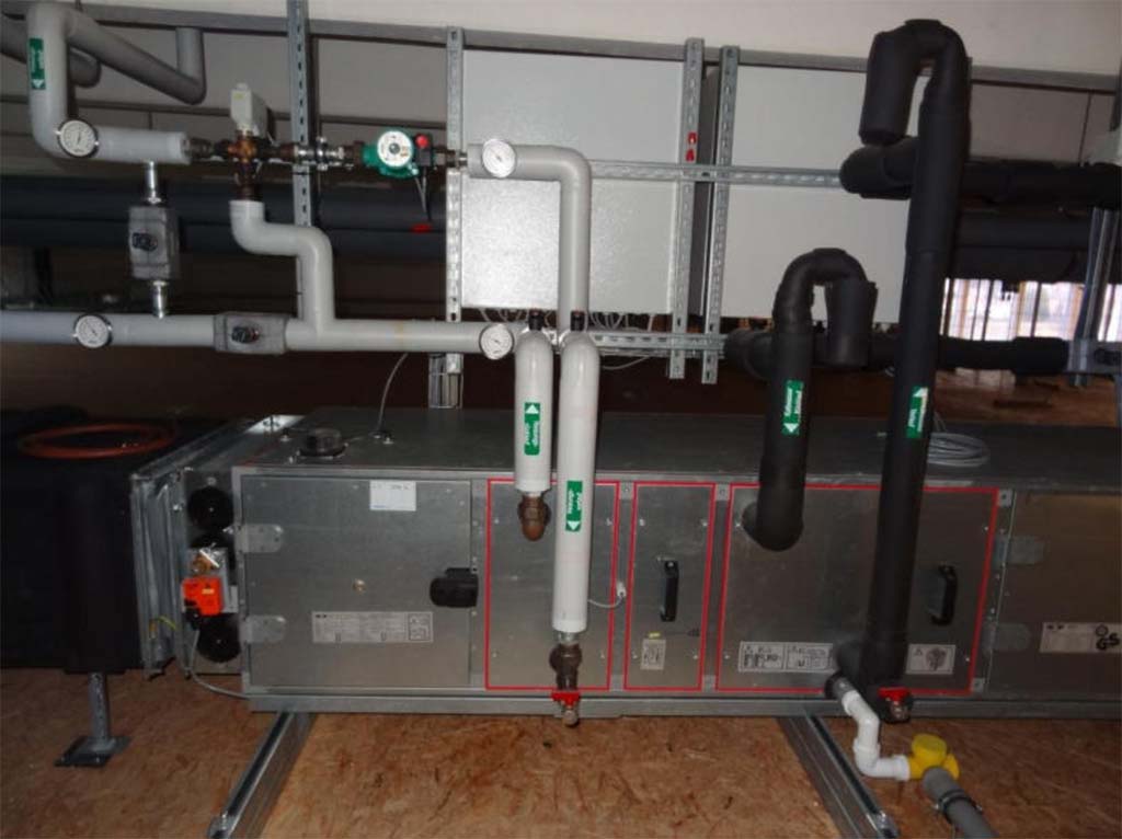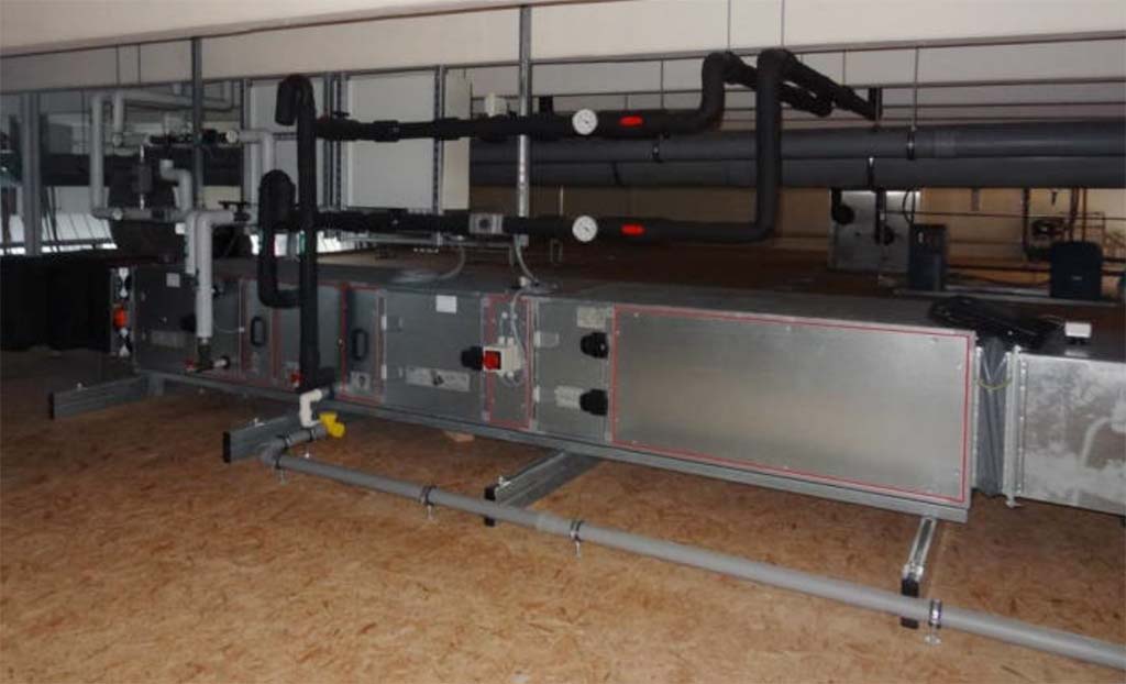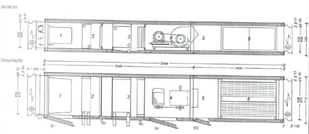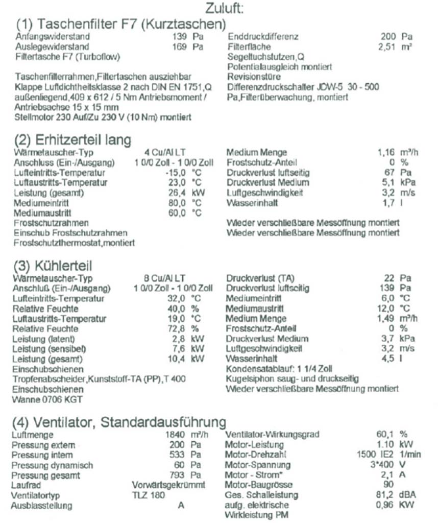 | Description Size supply air: Top 21, supply air volume: 1840m³/h, length: 3764mm, width: 712mm, height: 508mm, weight: 333kg. Equipment: pocket filter F7 (short pockets) with differential pressure switch, high air purification efficiency, heater section (long), high-performance heat exchanger for reliable heating, cooling section, prepared for external cooling supply including droplet separator, fan (standard version), energy-efficient and low-noise, empty section with flow distributor, for optimal airflow guidance, silencer type 12, effective noise reduction. Accessories: canvas connection, equipotential bonding, differential pressure switch. System is fully functional, condition very good. An on-site inspection is possible. |