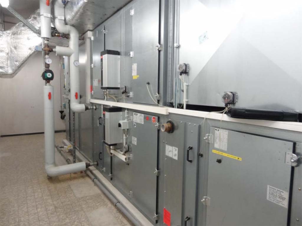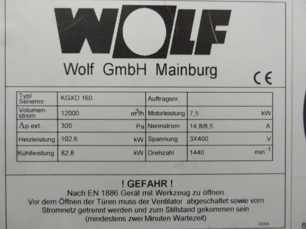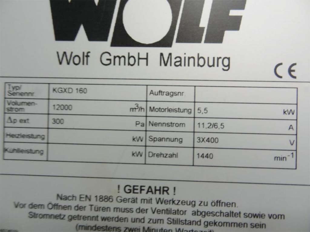 | Description Supply air unit Wolf KGXD 160: air volume: 12,000m³/h, external pressure loss: 300Pa, heating capacity: 102.6kW, cooling capacity: 82.8kW, motor power: 7.5kW, rated current: 14.8/8.5A, speed: 1440rpm. Exhaust air unit Wolf KGXD 160: air volume: 12,000m³/h, external pressure loss: 300Pa, motor power: 5.5kW, rated current: 11.2/6.5A, speed: 1440rpm. System is fully functional, an on-site inspection is possible. |