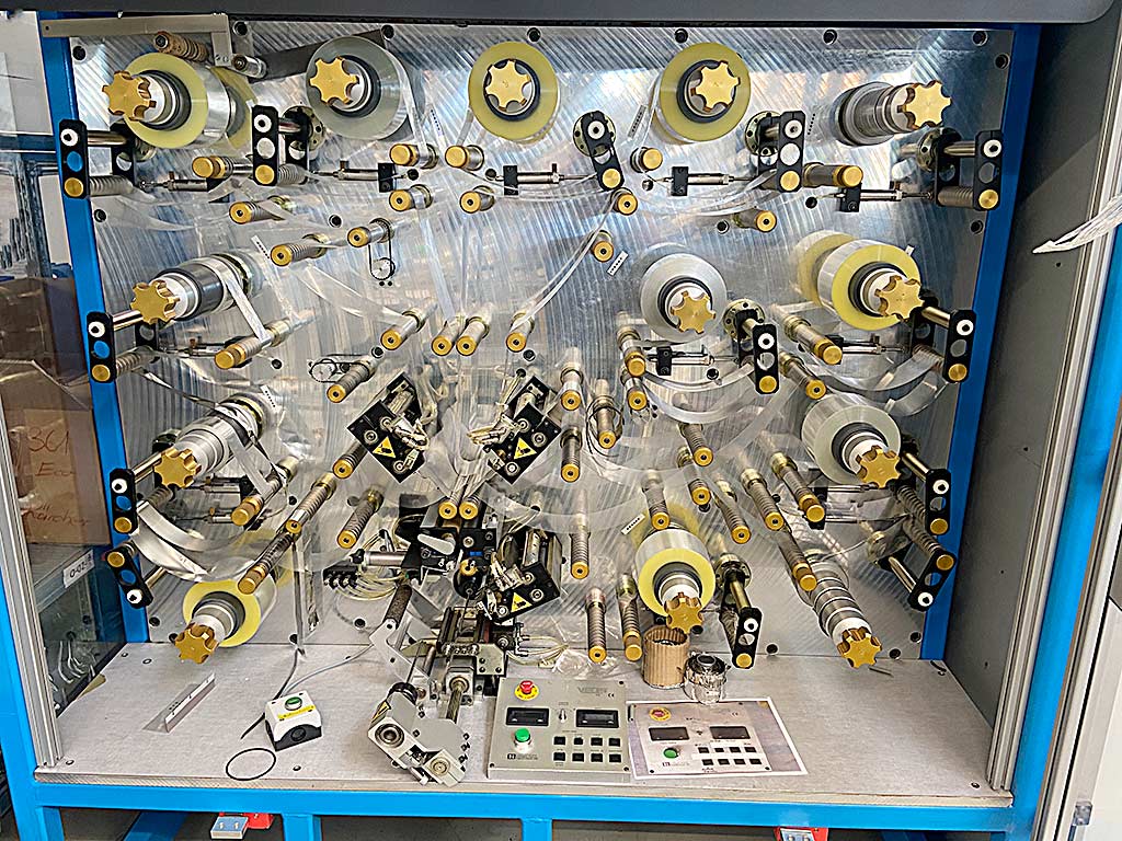 | Description A capacitor winding machine Hilton Industries in a perforator design with a center-wind system is available. Tool plate: aluminum, max. winding width: 125mm, min. web width: 38mm, dielectric spindles: 10, foil spindles: 3, max. roll diameter: 203mm, bobbin core inner diameter: 76mm, spindle design: O-ring, max. spindle load capacity: 11.3kg, working height range: 690mm-740mm. Machine dimensions X/Y/Z: approx. 2450mm/2050mm/2250mm, weight: approx. 2050kg. The machine control system is defective. Documentation available. An on-site inspection is possible. |