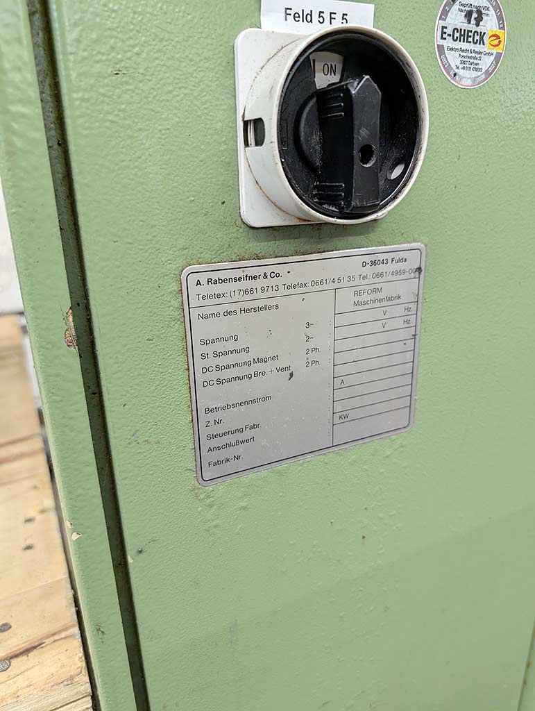 | Description A knife surface grinding machine Reform without coolant, separation and filtration system is available. Grinding length: 1300mm, magnetic table dimensions X/Y/Z: 1350mm/150mm/1300mm, grinding spindle power: 5.5kW, table swivel: +/-90°, machine dimensions X/Y/Z: approx. 3000mm/1000mm/1500mm, weight: approx. 1500kg. Documentation available. An on-site inspection is possible. |