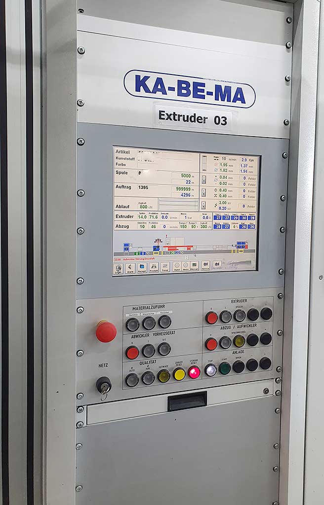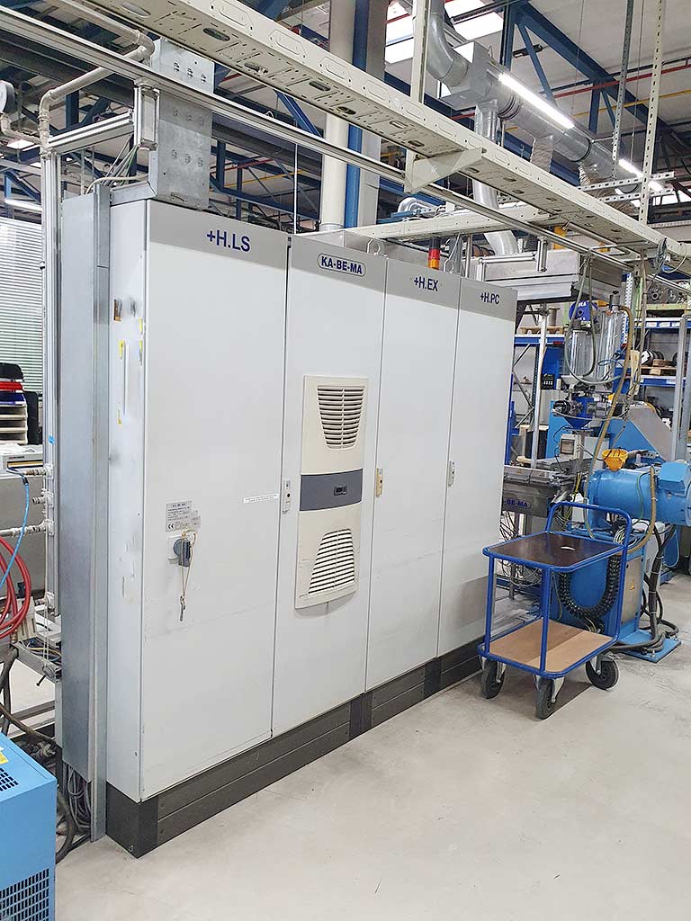 Three cable processing machines from a complete extrusion line are available. 1) Spindle pay-off Ka-Be-Ma AS400, spool flange diameter range: 140mm-400mm, min. core diameter: 90mm, max. spool width: 300mm, max. spool weight: 50kg, conductor diameter range: 0.1mm-1mm, max. pay-off speed: 600m/min, tensile force: 0.5N-20N, machine dimensions X/Y/Z: approx. 1200mm/1550mm/1450mm, weight: approx. 1000kg. 2) Cooling section Ka-Be-Ma T-KW-UKW-A-1,5, Zone 1: Process: immersion cooling, temperature range: 70°C-80°C, length: 2000mm. Zone 2: Process: spray cooling/deflection section, temperature: approx. 25°C. 3) Dual take-up Ka-Be-Ma DWST400-1, spool flange diameter range: 305mm-400mm, min. core diameter: 156mm, max. spool width: 282mm, conductor diameter range: 0.1mm-1mm, speed: 600m/min, tensile force range: 0.5N-1.5N, max. spool weight: 80kg, machine dimensions X/Y/Z: approx. 1200mm/1550mm/1450mm, weight: approx. 2200kg. Documentation available. An on-site inspection is possible.