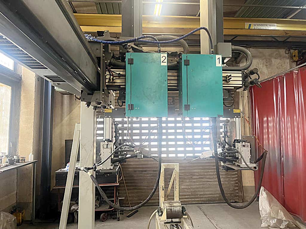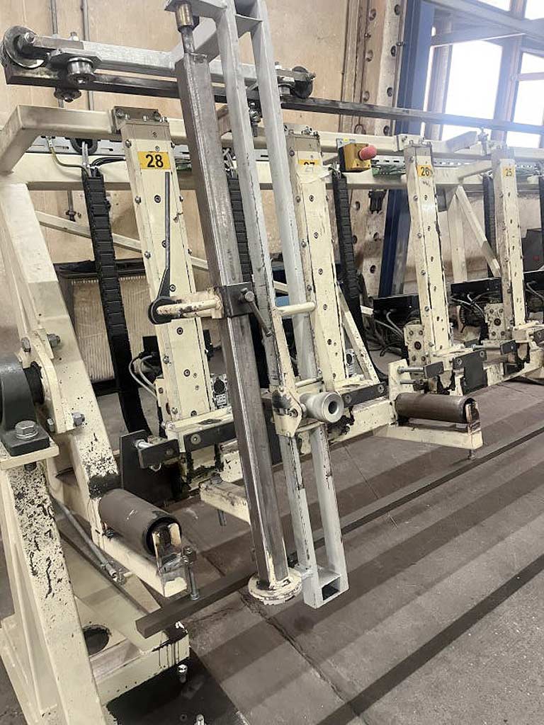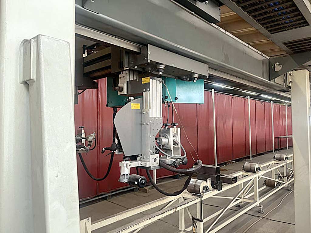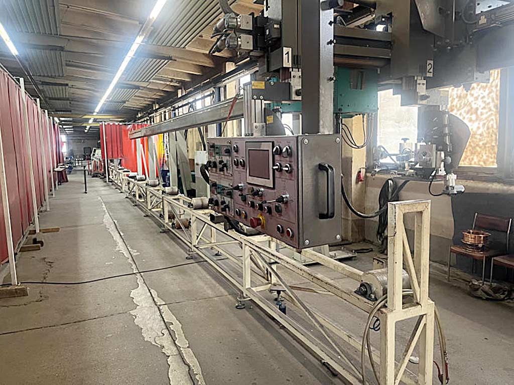 | Description A complete longitudinal beam welding system (vehicle carrier) Merkle with a tack welding station, a cooling station and a longitudinal beam welding machine is available. Beam height range: 70mm-500mm, max. beam length: 13700mm, flange width: 120mm/150mm, flange thickness range: 5mm-20mm, web plate thickness range: 3mm-10mm, clear width: 85mm-500mm, web offset at 15° transition: 50mm. 1) Welding system, track length: 20m, rotating device: 0°-45°, total clamping and tack welding range: 14300mm, guide spacing: 500mm, roller conveyor height: 800mm, welding process: MIG/MAG-Pulse-Arc, travel speed: 6m/min, vertical stroke: 800mm, horizontal stroke: 2x270mm, power sources: 2x HighPulse 550 RS, torch: MSB 400W. 2) Tack welding device, tack welding position: 45°, max. changeover time: 10min. 3) Transport and cooling line, tack welding area roller conveyor length: 15000mm, buffer and cooling area roller conveyor length: 15180mm, welding area roller conveyor length: 18055mm, roller diameter tack/buffer/welding: 80mm/80mm/200mm, roller width: 245mm/245mm/2200mm. Documentation vorhanden. An on-site inspection is possible. |