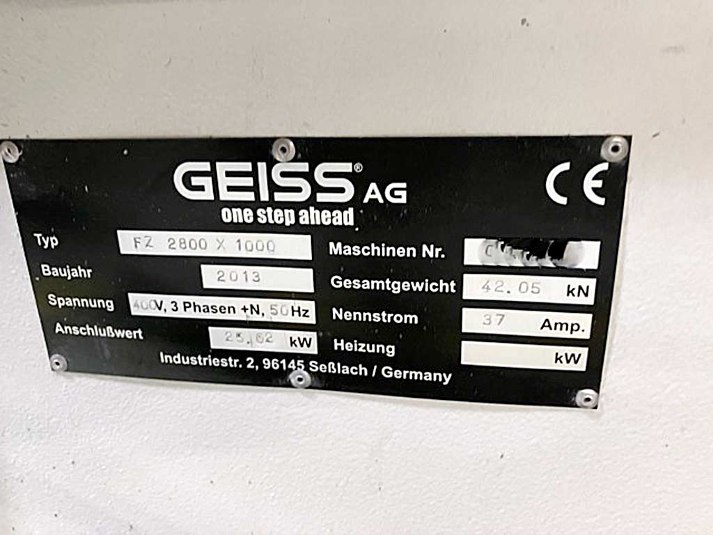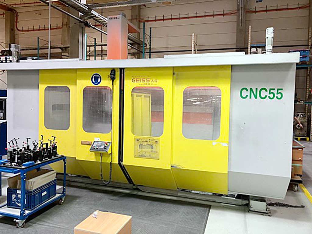 | Description Two Geiss CNC machining centers are available. 1) Geiss FZ 2000x1000, year of manufacture: 2012, travel path X/Y/Z: 2450mm/1400mm/800mm, B-axis: 285°, C-axis: 520°, speed: 30000rpm, table dimensions X/Y: 2000mm/1000mm, machine dimensions Y/Z: 2500mm/2450mm, weight: approx. 30500kg. 2) Geiss FZ 2800x1000, year of manufacture: 2013, table dimensions X/Y: 2800mm/2000m, weight: approx. 42000kg. Documentation available. An on-site inspection is possible. |