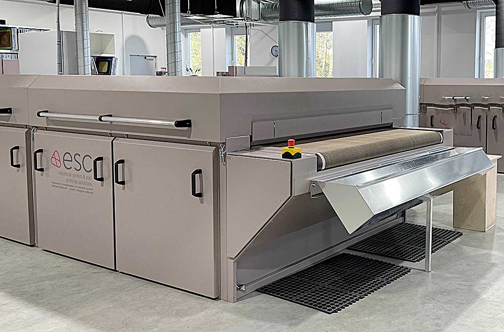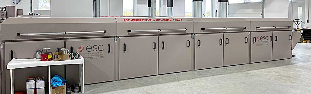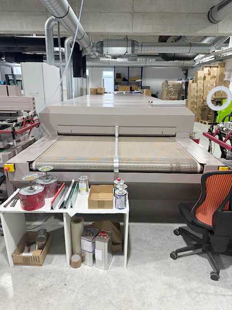 | Description A continuous drying system ESC with an integrated UV intermediate module for printing use is available. Heating chamber: fan type: TRZ 250-3, length: 2000mm, recirculating air volume at 510Pa: 3400m³/h, max. temperature: 80°C, heating capacity: 18kW. Cooling chamber: fan type: TRE 250-3, length: 2000mm, air volume flow: 3400m³/h. UV intermediate module: belt width: 1700mm, emitters: 2, max. emitter power: 120W/cm. Belt height: 900mm, outlet element length: 500mm, inlet length: 1200mm, zone lengths: 2000mm, system width: approx. 2250mm, total length: approx. 10700mm. Documentation available. An on-site inspection is possible. |