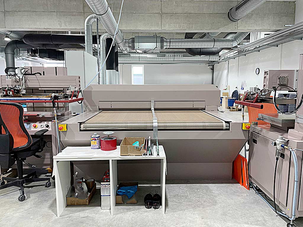 | Description A continuous drying system ESC for printing use is available. Heating chamber: fan type: TRZ 250-3, length: 2000mm, recirculated air volume at 510Pa: 3400m³/h, max. temperature: 80°C, heating capacity: 18kW. Cooling chamber: fan type: TRE 250-3, length: 2000mm, air volume flow: 3400m³/h. Belt height: 900mm, discharge element length: 500mm, infeed length: 1200mm, zone lengths: 2000mm, system width: approx. 2250mm, total length: approx. 10700mm. Documentation available. An on-site inspection is possible. |