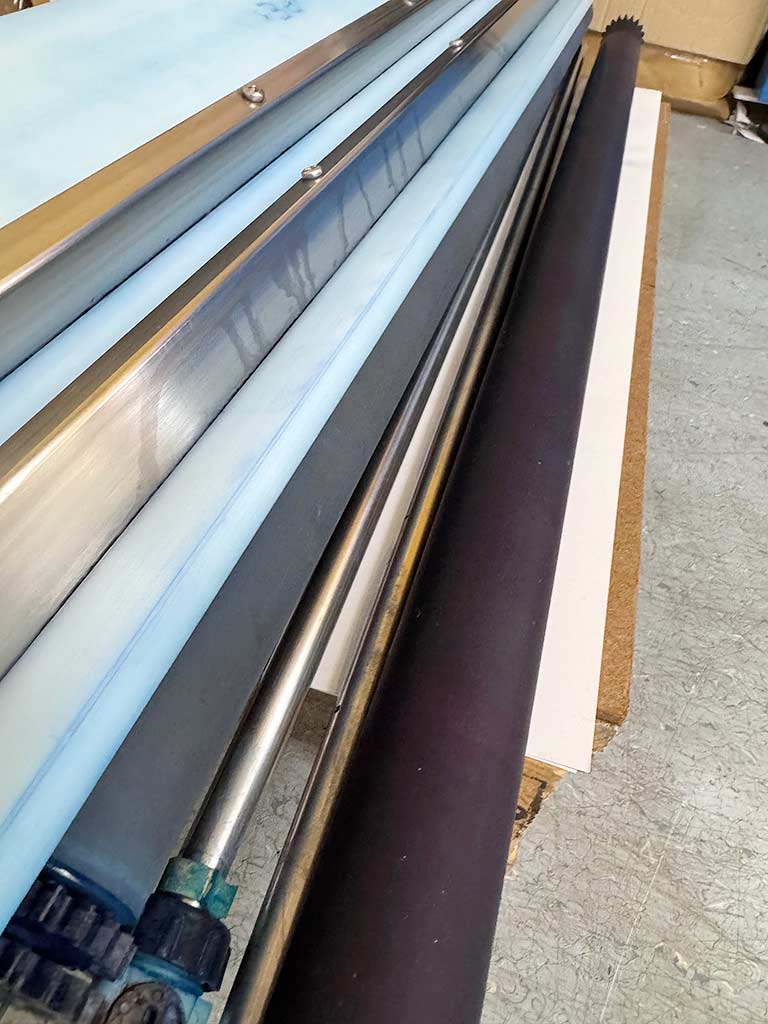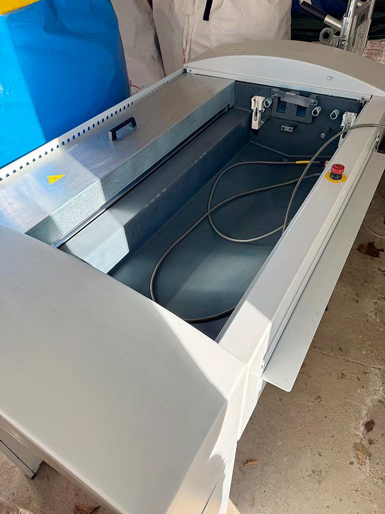 A continuous-flow washout machine Glunz & Jensen for washing out and simultaneous gumming of chemistry-free offset printing plates is available. Brushes: 2, max. working width: 851mm, min. plate width: 231mm, min. plate length: 300mm, max. plate length: 1100mm, plate thickness range: 0.15mm-0.3mm. Machine dimensions X/Y/Z: approx. 1400mm/700mm/1100mm, weight: approx. 130kg. The machine has been cleaned, dismantled and is stored in a dry warehouse. Documentation available. An on-site inspection is possible.