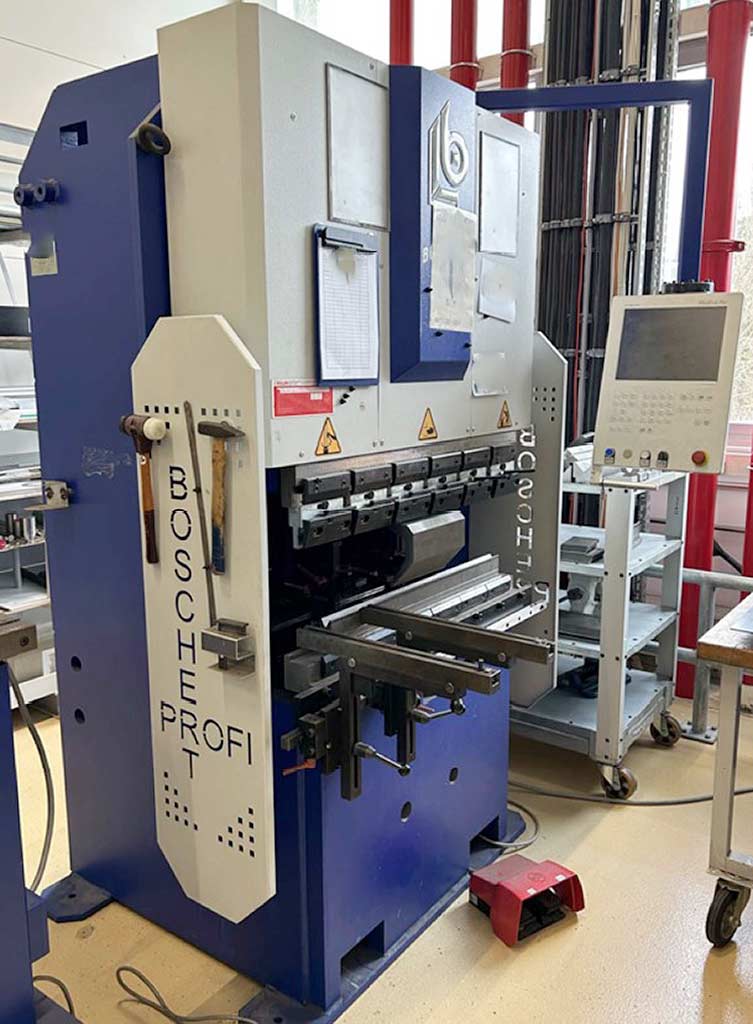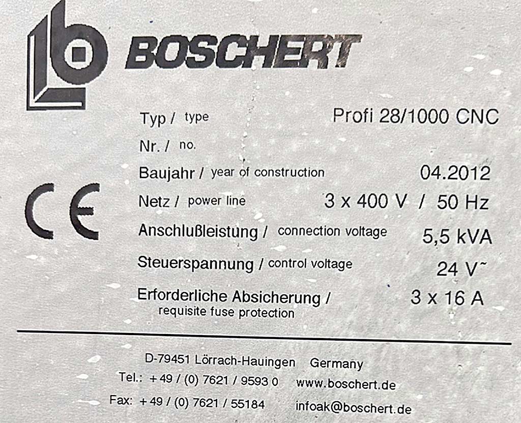 | Description A CNC press brake Boschert is available. Press force: 28t, bending length: 1000mm, max. sheet thickness: 10mm, tool clamping: WILA, backgauge axes: 2, stop faces: 4, repeatability: +/-0.02mm, control: Cybelec ModEva Pac/CybTouch 15. Including accessories. Documentation available. An on-site inspection is possible. |