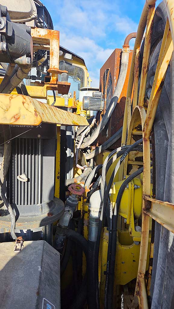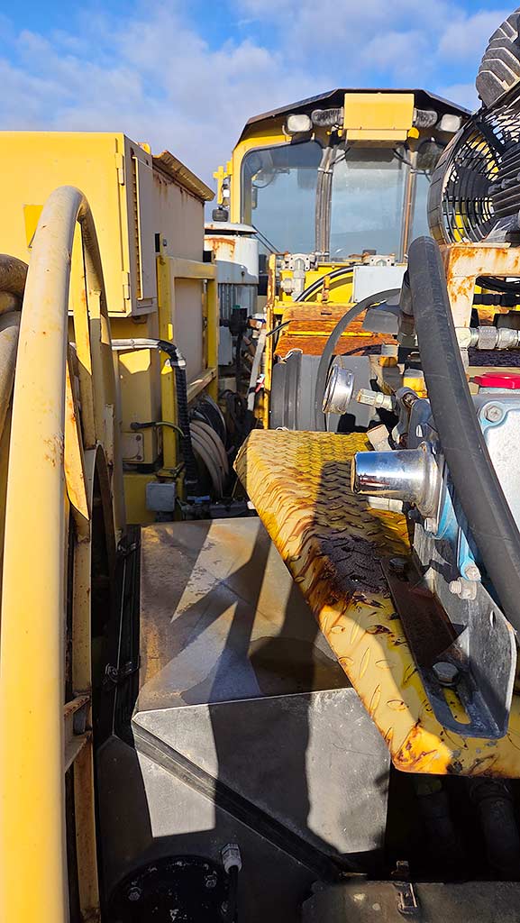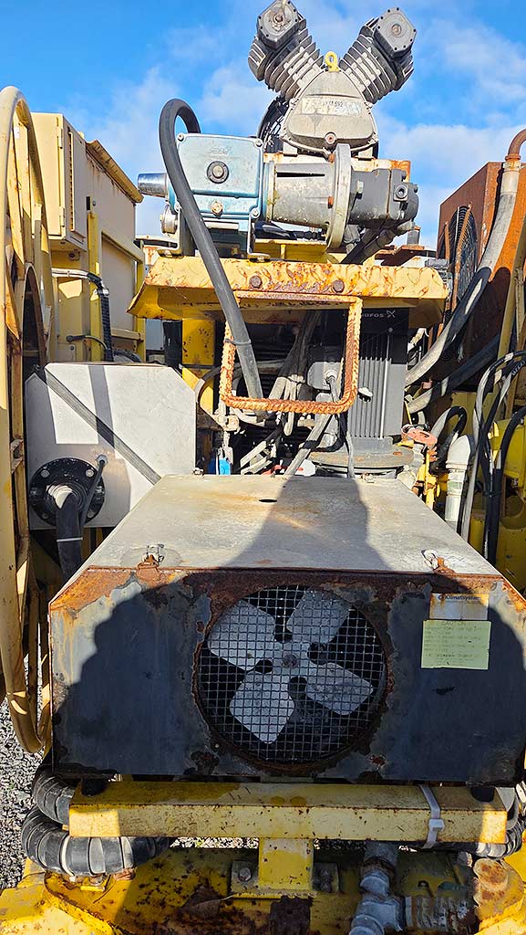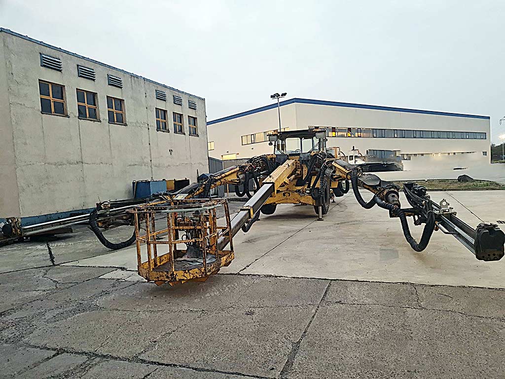 | Opis With articulated carrier DC26, load: 108kW, max. driving speed 16km/h, tyre size: 14.00 R24 A, 2x drill arm BUT 35, Diesel Power Generator Deutz BF4M 1013C, drill mounts BMH 6414, max. drill rod length: 4321mm, max. drilling depth: 4020mm, loading platform HL 210, CE standard, air/water flushing, heat exchanger and high-pressure pump Swellex, without drill hammers. |