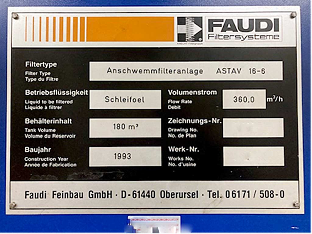 Opis A candle filter system Faudi with precoating principle for the treatment and purification of grinding oil is available. Operating fluid: grinding oil, flow rate: 360m³/h, tank capacity: 180m³, control: Siemens. Documentation available. An on-site inspection is possible. |