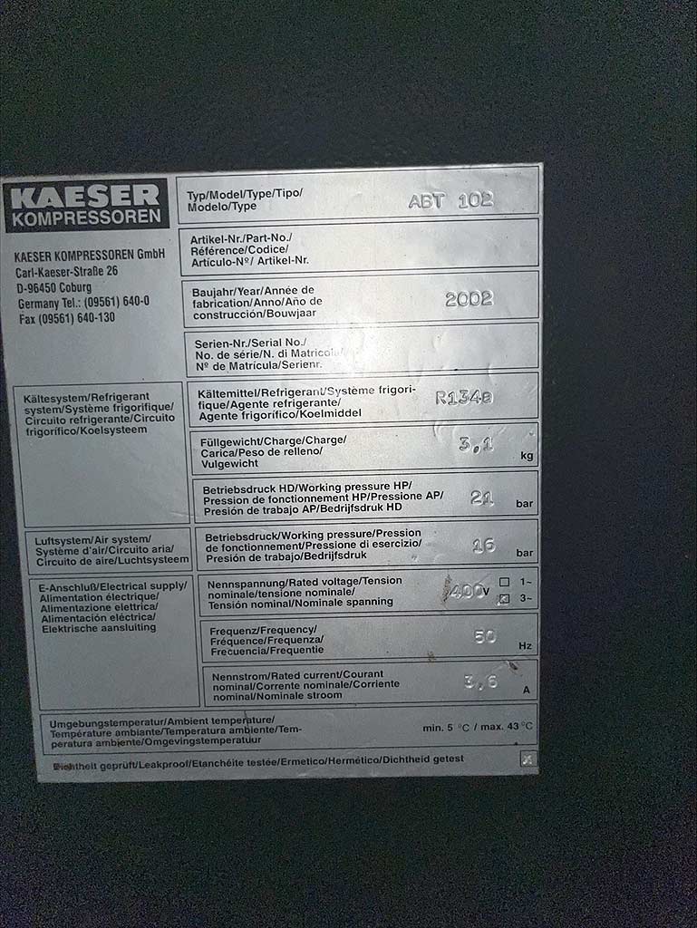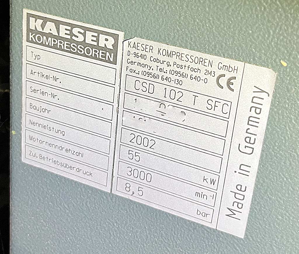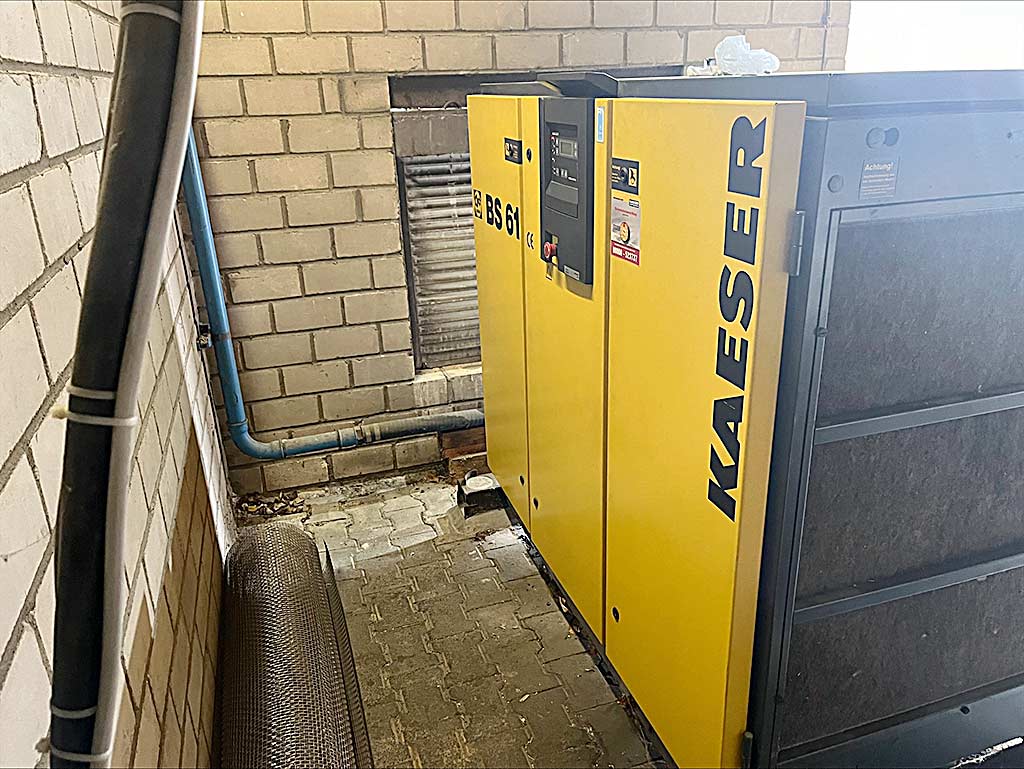 Opis Two compressors Kaeser are available. 1) Kaeser CSD 102 T SFC, year of manufacture: 2002, rated power: 55kW, max. operating pressure: 8.5bar, refrigerant: R134a, refrigerant quantity: 3.1kg, operating hours: approx. 132150h, load hours: approx. 129858h. 2) Kaeser BS 61, year of manufacture: 2001, rated power: 31kW, max. operating pressure: 8bar, operating hours: 91889h, load hours: 78711h. Documentation available. An on-site inspection is possible. |