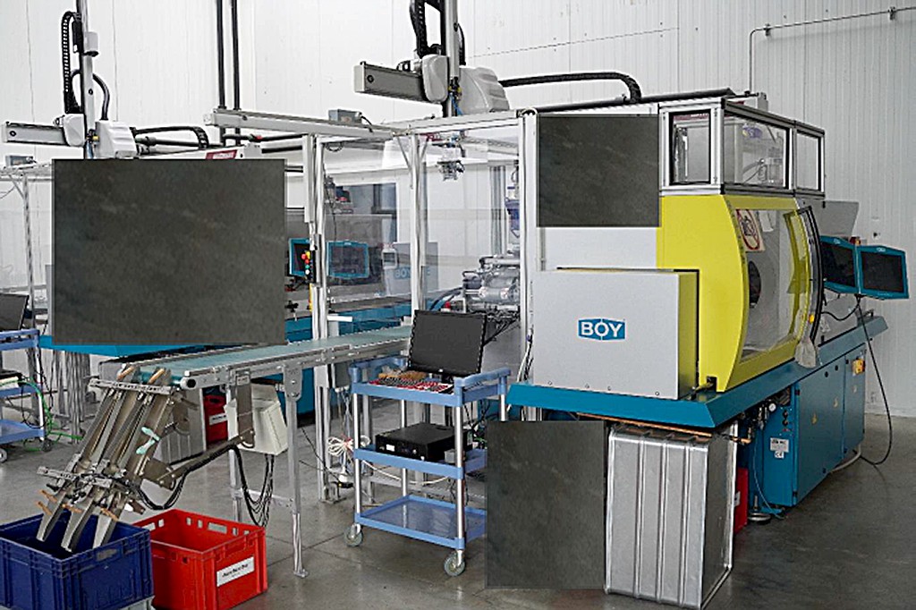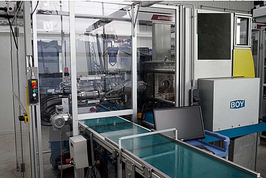| Opis Offered is a Boy 80E 2K injection molding machine (year 2016, approx. 29398 operating hours) including 2C XS aggregate, Wittmann Primus 16 handling (year 2022), Dorner GAL-60 conveyor. 800kN clamping force, 2-fold core pull, 2-fold air blast, 24mm screw, completely enclosed, hydraulic ejector 42.7kN, EUROMAP 67 interface, robot stroke X/Y/Z: 2000mm/1200mm/620mm, conveyor 400mm width, 2m length. Viewing is possible by arrangement. |