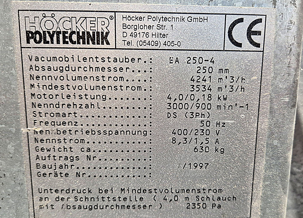 | Opis Offered: Vacumobilmobilentstauber year 1997. Extraction diameter 250mm, nominal volume flow 4241m³/h, minimum volume flow 3534m³/h, negative pressure at minimum volume flow 2350Pa (measured at the interface with a 4.0m hose Ø250mm), motor power 4.0kW/0.18kW, nominal speed 3000min⁻¹/900min⁻¹, weight approx. 630kg. Inspection is possible by appointment. |