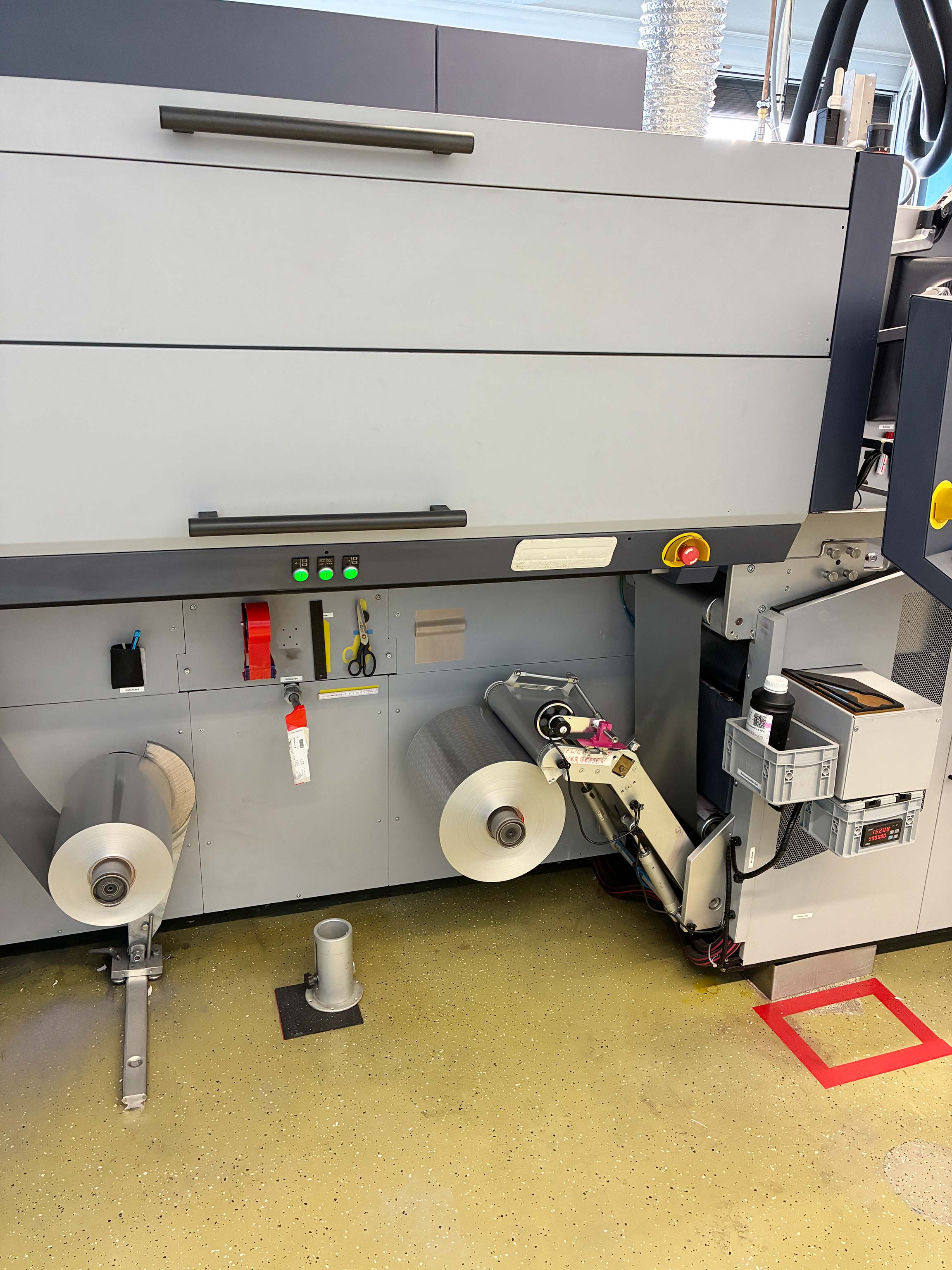 | Opis Printing technology: piezo DOD printheads: Xaar 1001, resolution: 720x360dpi, drying: 1xUV GOZ and 1xUV FOZ Höhnle with 7,2kW, pinning system (LED) after printing unit 1+5, extraction: in the drying unit for cooling the UV lamps and for odor minimization and improvement of sensory conditions, inert gas system: oxygen-reduced curing unit (inert gas system), consumption: under 6m³/h, printing: roll-to-roll, web width: 350mm, print width: 330mm, repeat length: min./max. printable section length 10-1000mm, print tolerance: single spacing +/-0,2mm, cumulative spacing: +/-1,5mm (over one meter), register: register accuracy +/-50μm, max. speed: 48m/min with 4 colors depending on ink coverage, white at 30m/min, speed must be preselected from 18 to 48m/min, print pre-treatment: corona with 1500VA, web cleaning: polymer rollers LC 350, air shafts: for cores with 76mm diameter for unwinding and rewinding, air shaft clamping pneumatic, clamping releasable to allow rotation of the winding mandrel, max. roll diameter for unwinding and rewinding: 610mm, max. roll weight for unwinding and rewinding: 120kg. power consumption: approx. 39kVA/60A, air consumption: 100NL/min, cooling capacity: approx. 60.000BTU/h =18kW, data interface: USB2.0, Ethernet, data format: PDF-X1 or X3 or EPS or AI, length: 4550mm, width: 1750mm, height: 2200mm, weight: approx. 3t. With documentation, chiller unit and inks. The machine is fault-free, complete and ready for operation, and has been serviced regularly. On-site inspection is possible. |