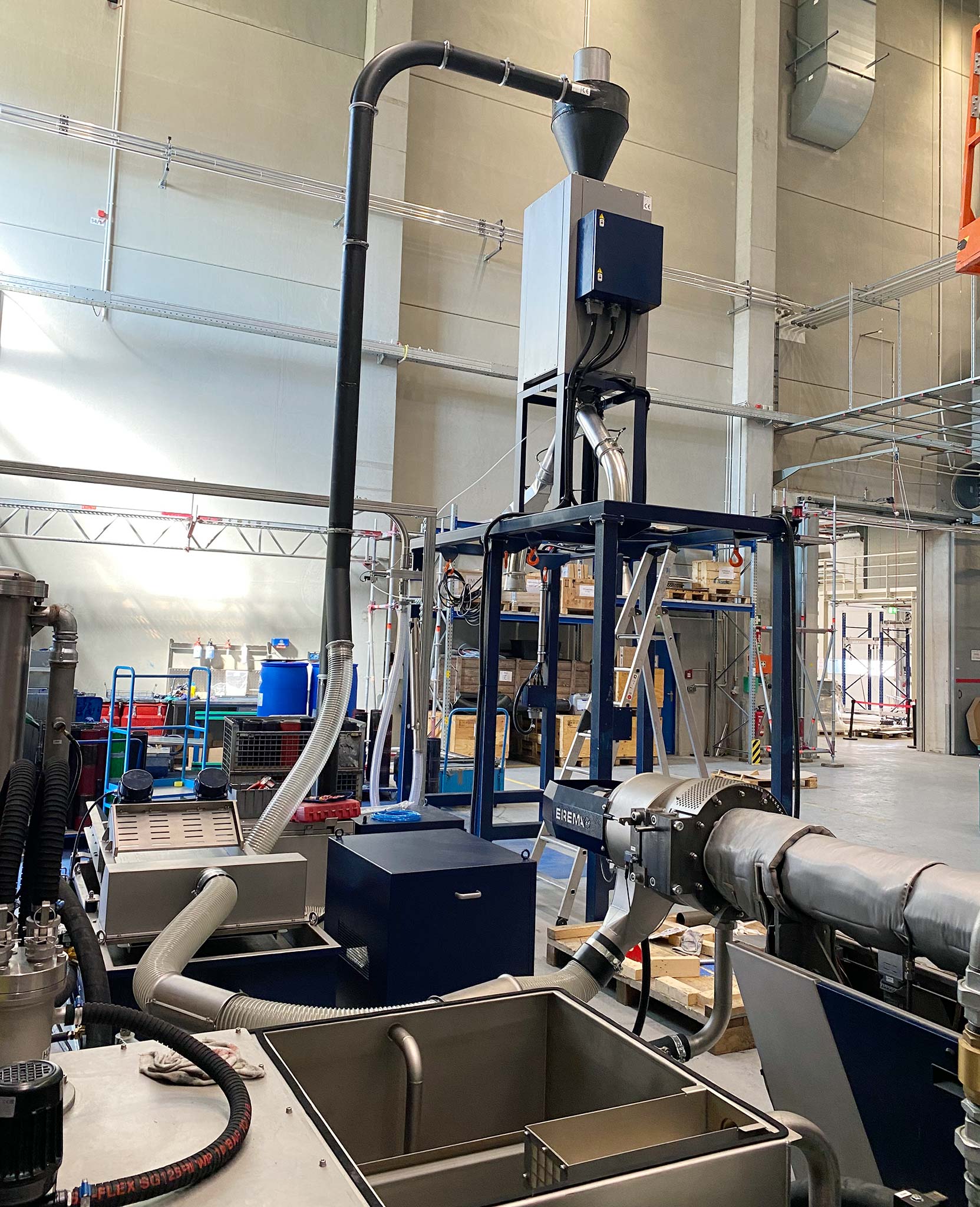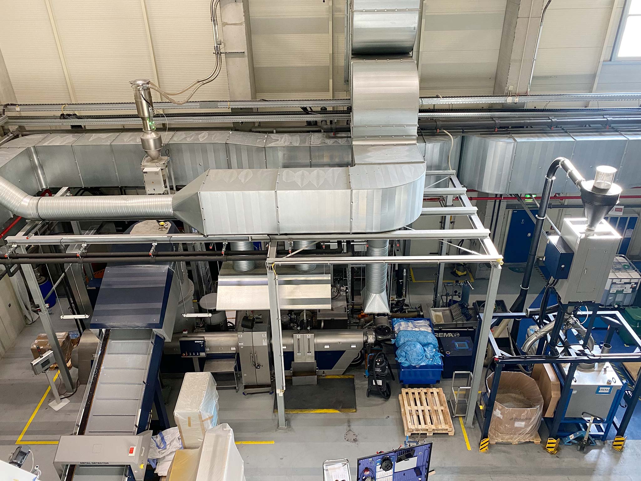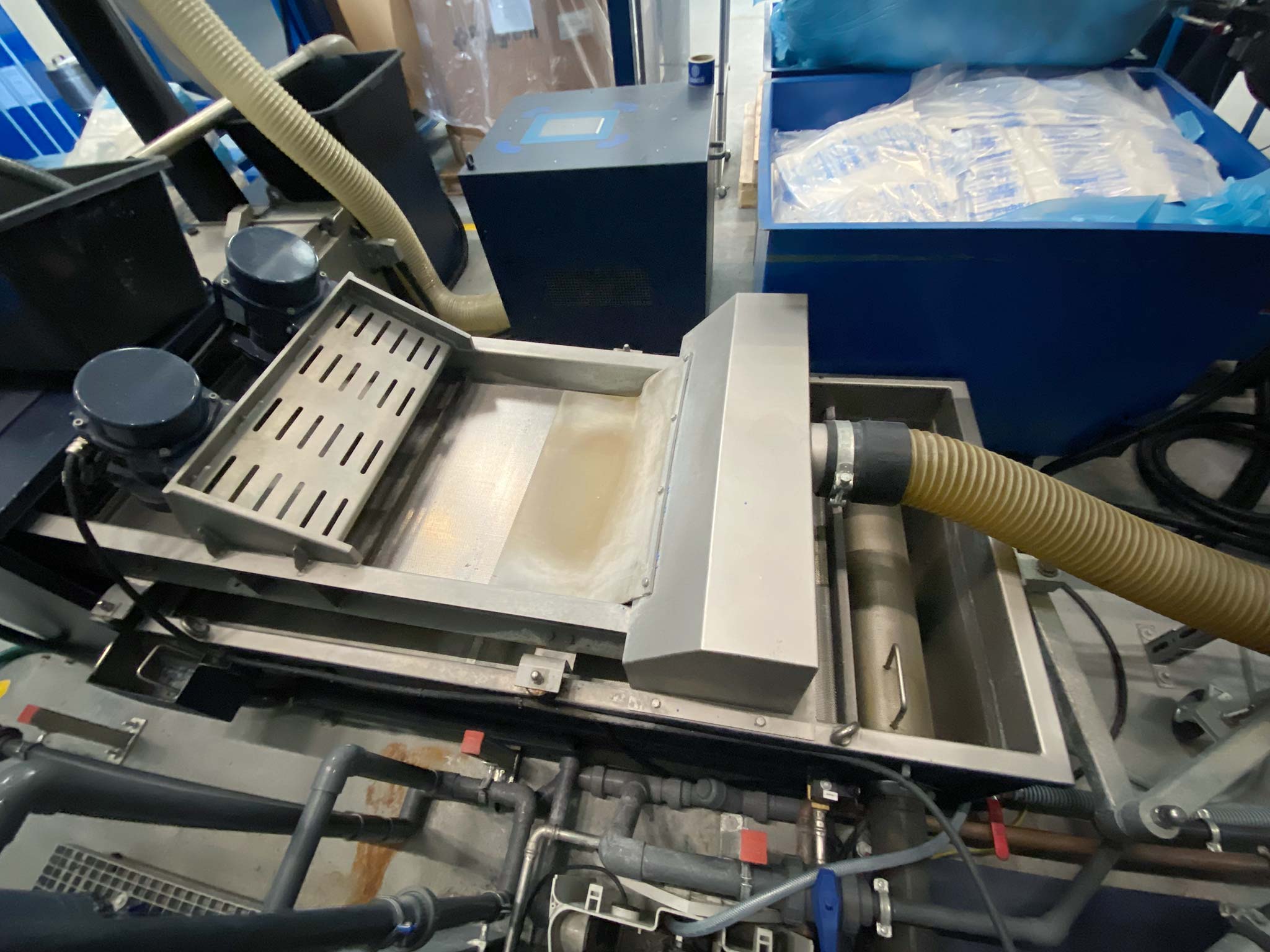 | Opis Recycling system with regranulation line, conveyor belt, roller infeed, granulate dosing unit, twin-screw stuffing unit and bagging station, 1) Regranulation line, components: Piovan feeding, backflush filter, extraction system, process-water tank, hot-die-face granulation, granulate dewatering screen, water pump station, granulate scale, granulate centrifugal dryer, granulate conveying system, filling station, swivel side wall for PCU hood. Throughput capacity MDPE, LDPE: 650-725kg/h, PCU drive: 132kW, weight: 12,680kg, extraction system air capacity: max. 3000m³/h, weight: 174kg, process-water tank filling volume: approx. 860l, backflush filter screen diameter: 215mm, number of screen packs: 4, hot-die-face granulation number of knives: 4, knife head speed: 1420/min, granulate dewatering screen dimensions: 1900x700mm, oversize separation: less than 20mm, trough volume: 470l, granulate centrifugal dryer drive power: 7.5kW, granulate conveying system air capacity: max. 1900m³/h, length (without BigBag station): approx. 11,642mm, width: approx. 8000mm, 2) Conveyor belt with hopper, level sensor and double-layer metal detector, weight: approx. 950kg, belt dimensions: 7000x1100mm, with cleats, metal detector coil aperture: 1300x400mm, detection: all metals, measuring accuracy: Fe= M6 nut, V2A= M10 nut, technology: digital, alarm: visual and acoustic, 3) Roller infeed, infeed cross-section: 450x150mm, drive power: 1x 1.5kW, max. infeed speed: 20m/min, 4) Granulate dosing unit, operating principle: gravimetric, bulk density: 0.6kg/dm³, dosing range: 4-40kg/h, 5) Twin-screw stuffing unit, bulk density: 0.6kg/dm³, throughput capacity: max. 100kg/h, screw diameter: 40mm, 6) Bagging station, frame: for 2 BigBags, diverter: pneumatic, with level sensor, operating hours reading: 6400h. With complete documentation, additional spare parts are optionally available. An on-site inspection is possible. |