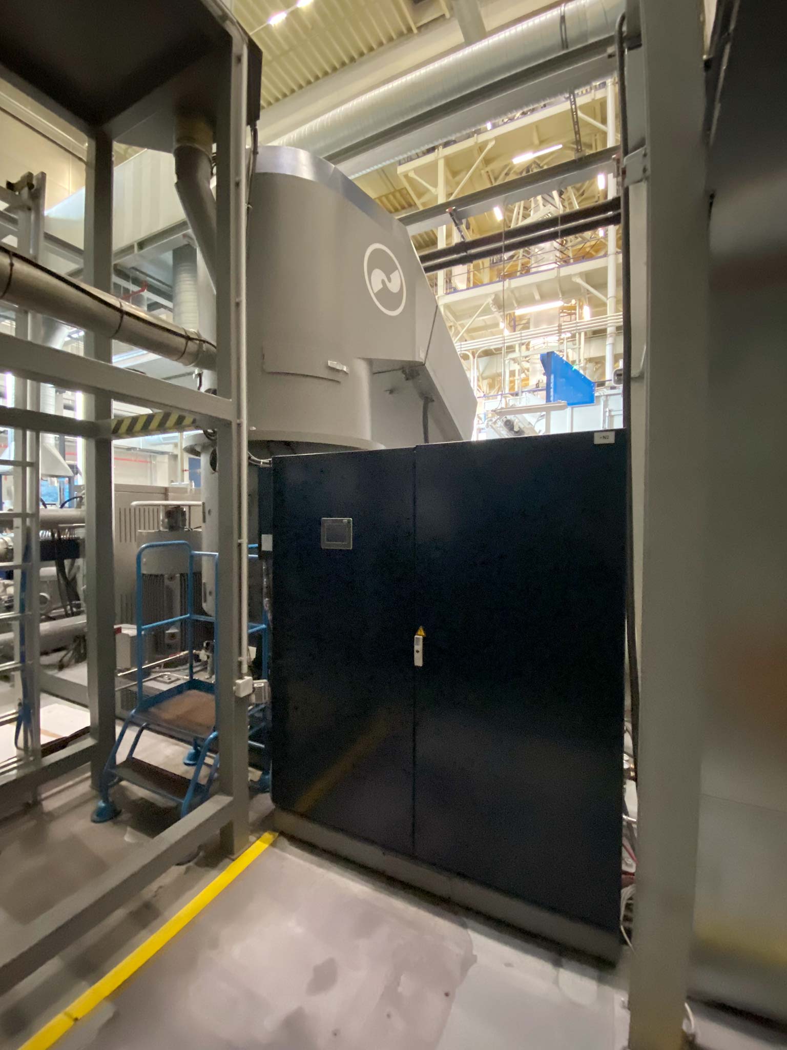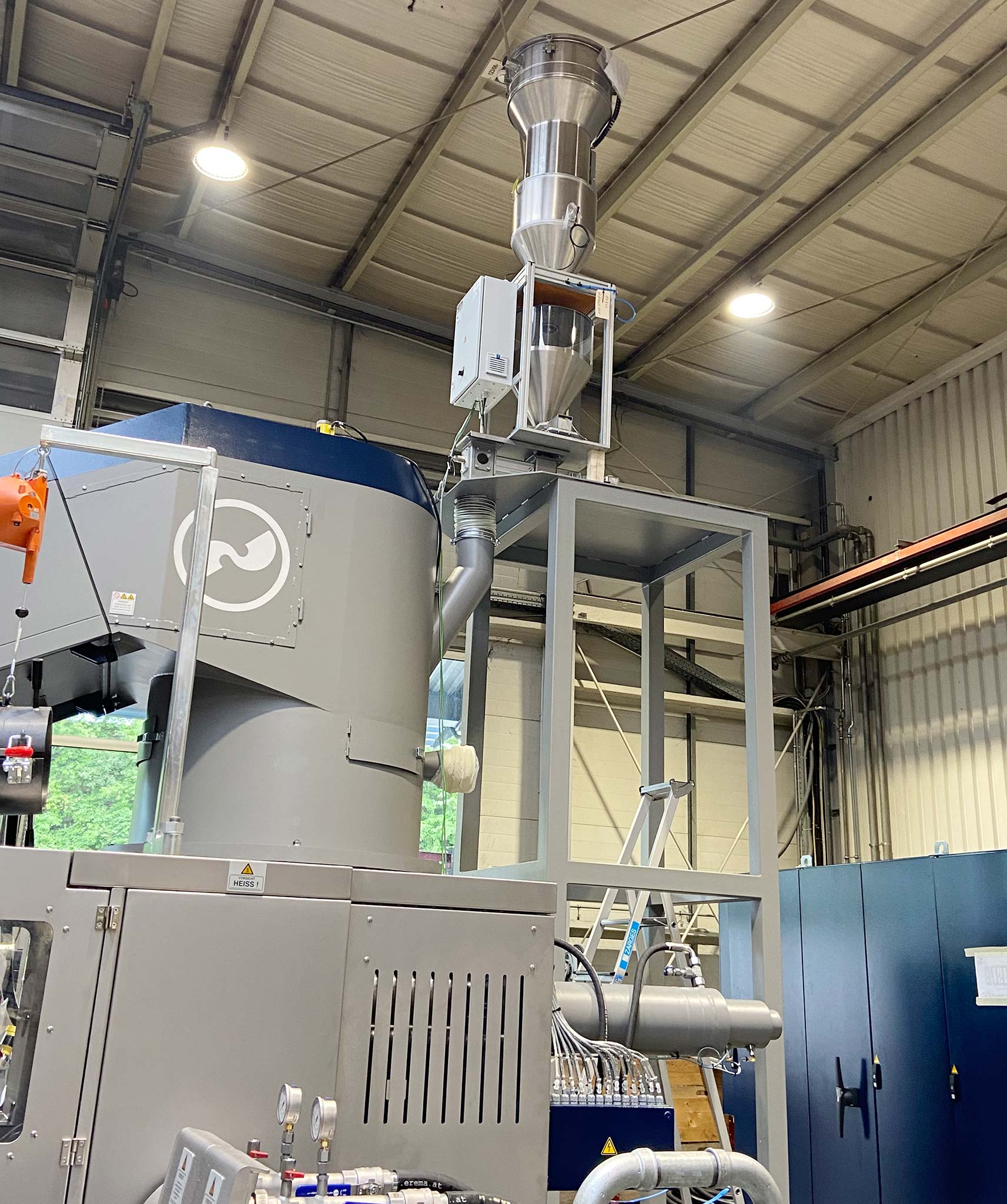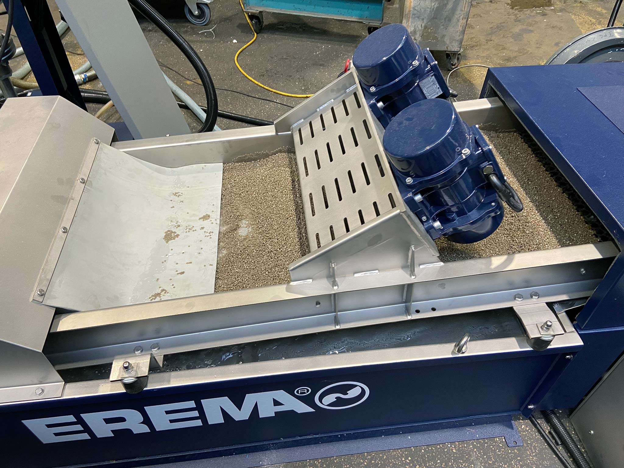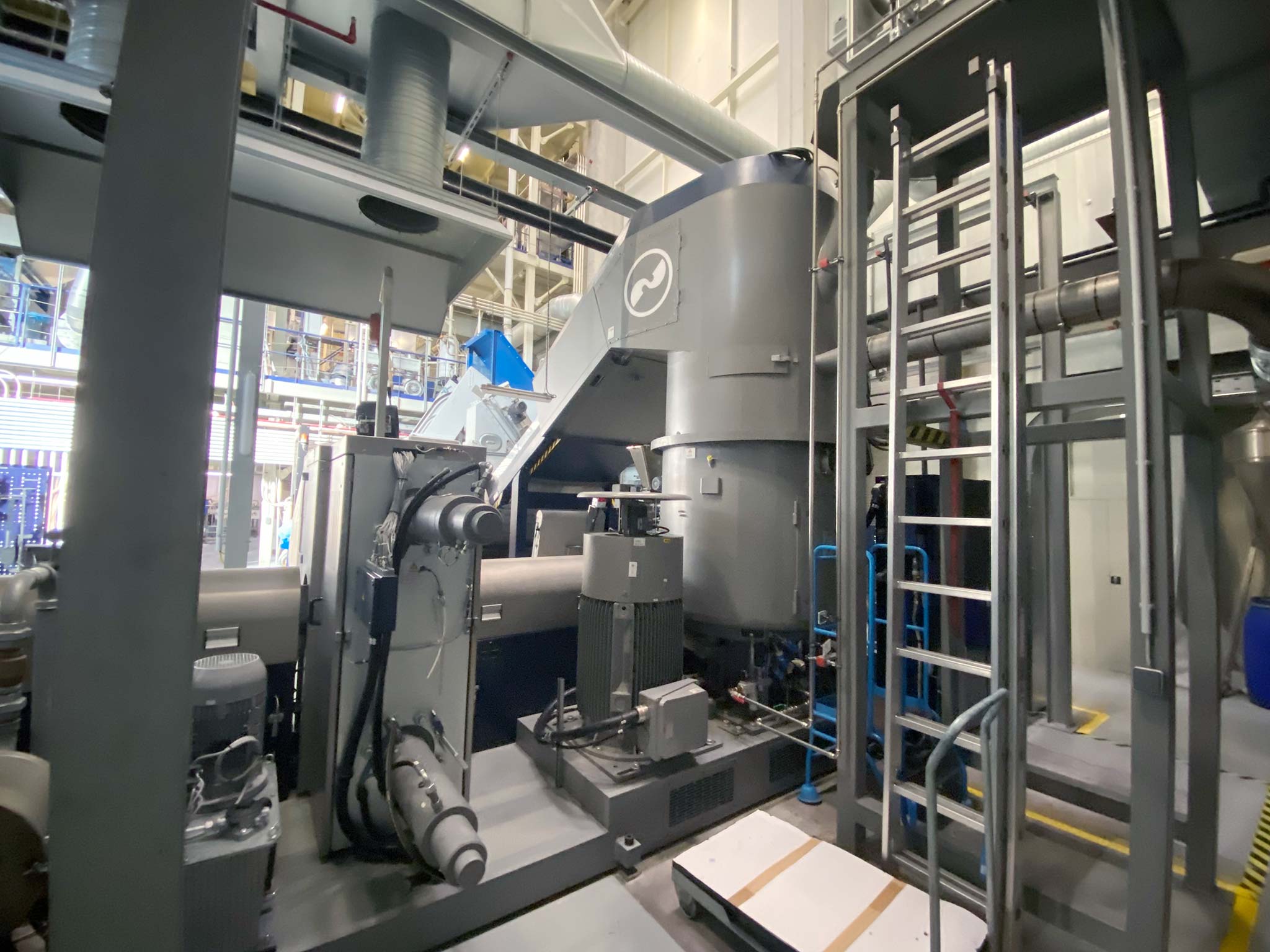 | Opis Recycling system with regranulation line, conveyor belt, roller infeed, granulate dosing unit, twin-screw stuffing unit and bagging station, 1) Regranulation line, components: Piovan feeding, backflush filter, extraction system, process-water tank, hot-die-face granulation, granulate dewatering screen, water pump station, granulate scale, granulate centrifugal dryer, granulate conveying system, filling station, swivel side wall for PCU hood. Throughput capacity MDPE, LDPE: 650-725kg/h, PCU drive: 132kW, weight: 12,680kg, extraction system air capacity: max. 3000m³/h, weight: 174kg, process-water tank filling volume: approx. 860l, backflush filter screen diameter: 215mm, number of screen packs: 4, hot-die-face granulation number of knives: 4, knife head speed: 1420/min, granulate dewatering screen dimensions: 1900x700mm, oversize separation: less than 20mm, trough volume: 470l, granulate centrifugal dryer drive power: 7.5kW, granulate conveying system air capacity: max. 1900m³/h, length (without BigBag station): approx. 11,642mm, width: approx. 8000mm, 2) Conveyor belt with hopper, level sensor and double-layer metal detector, weight: approx. 950kg, belt dimensions: 7000x1100mm, with cleats, metal detector coil aperture: 1300x400mm, detection: all metals, measuring accuracy: Fe= M6 nut, V2A= M10 nut, technology: digital, alarm: visual and acoustic, 3) Roller infeed, infeed cross-section: 450x150mm, drive power: 1x 1.5kW, max. infeed speed: 20m/min, 4) Granulate dosing unit, operating principle: gravimetric, bulk density: 0.6kg/dm³, dosing range: 4-40kg/h, 5) Twin-screw stuffing unit, bulk density: 0.6kg/dm³, throughput capacity: max. 100kg/h, screw diameter: 40mm, 6) Bagging station, frame: for 2 BigBags, diverter: pneumatic, with level sensor, operating hours reading: 6400h. With complete documentation, additional spare parts are optionally available. An on-site inspection is possible. |