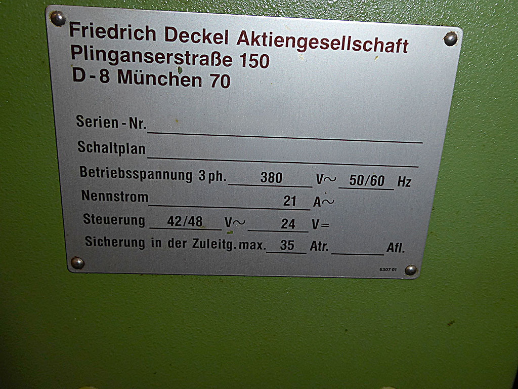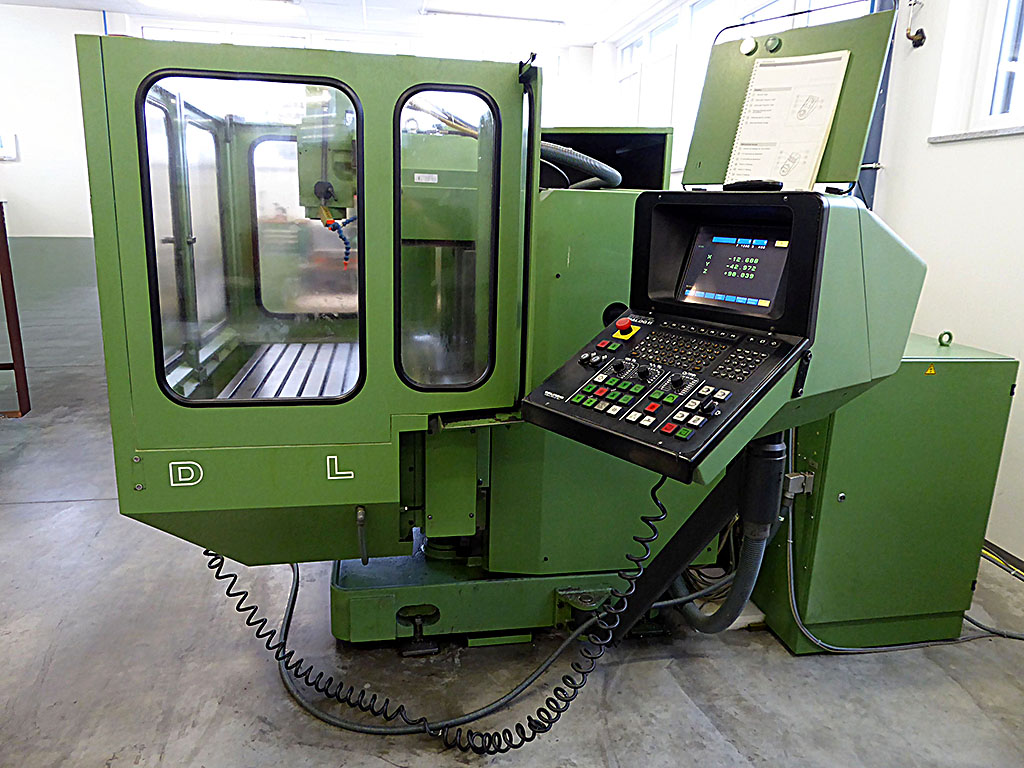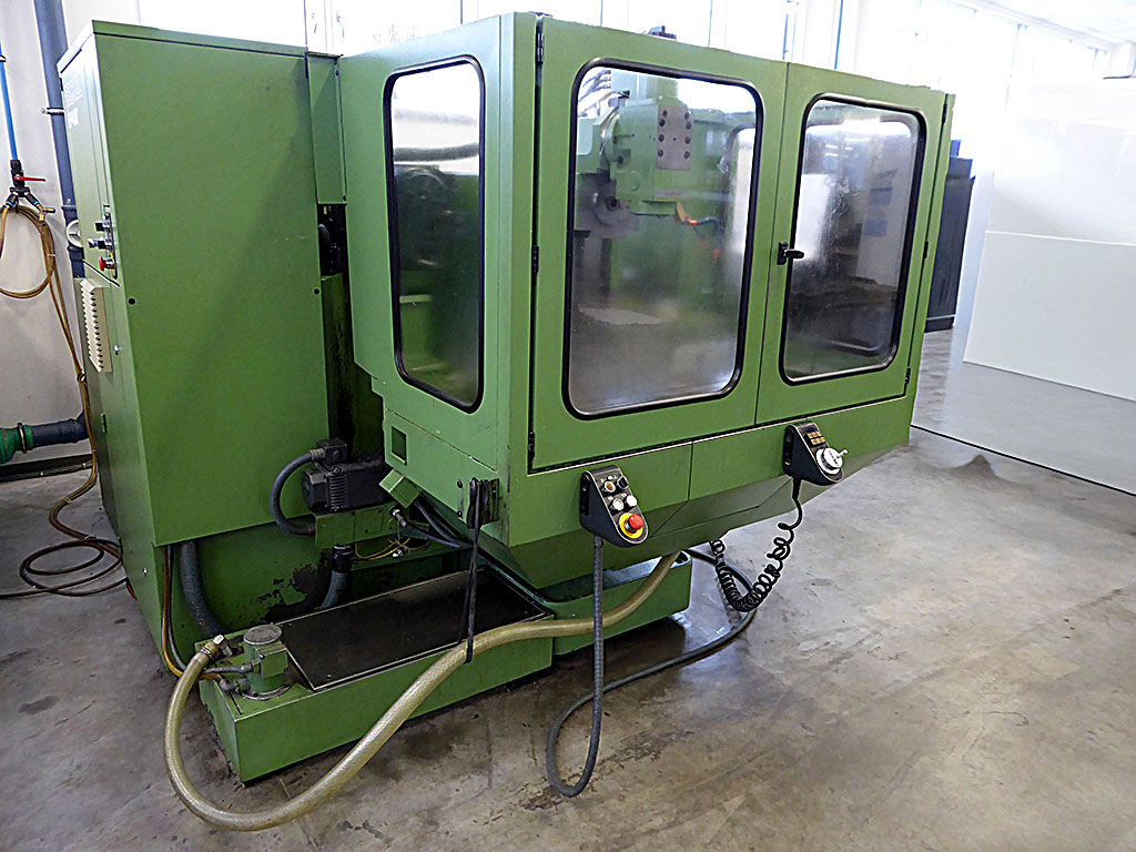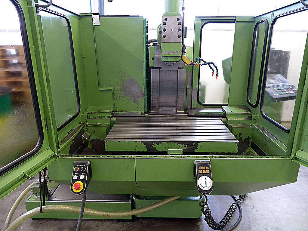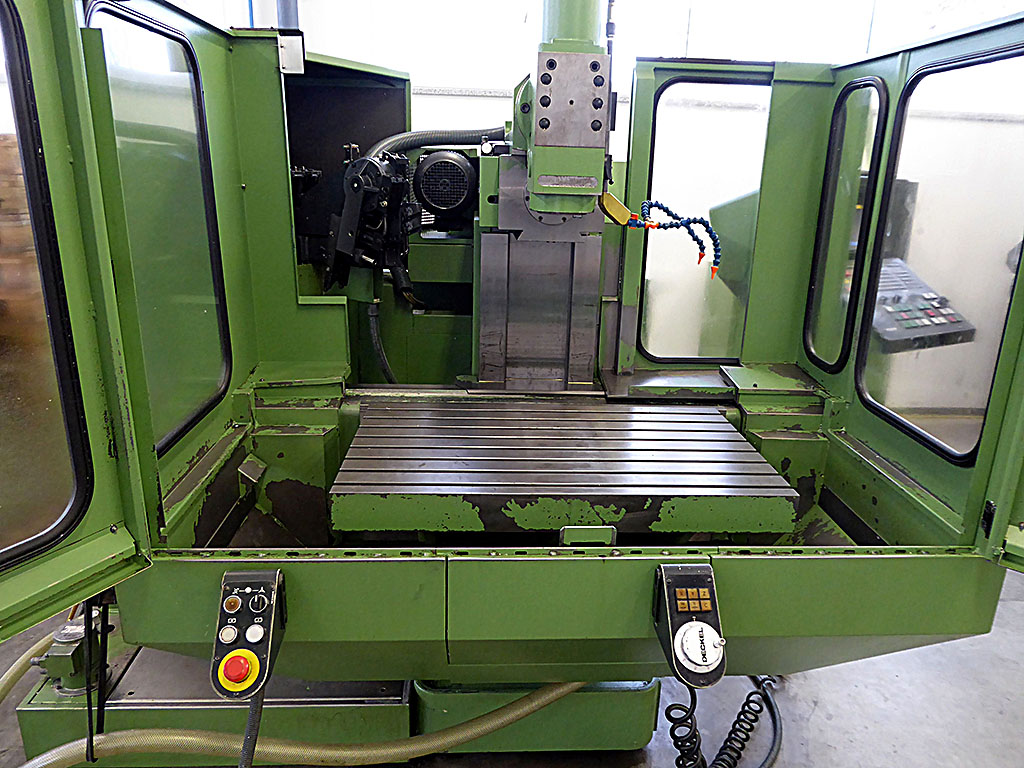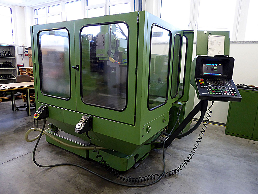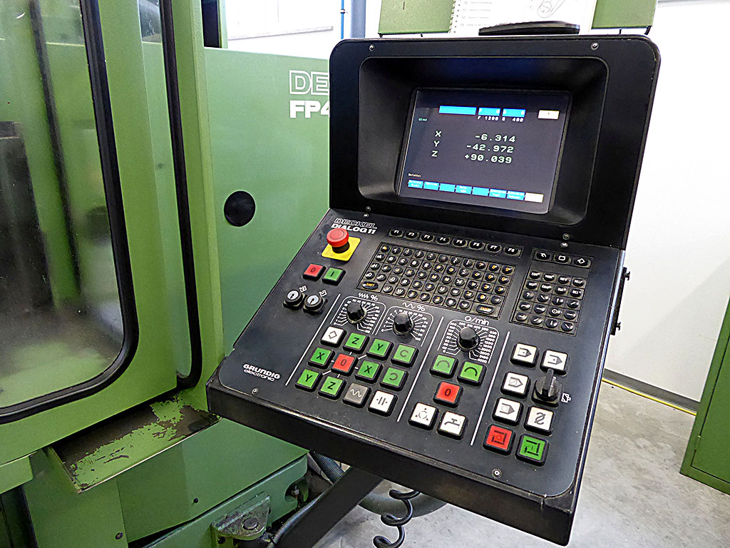 | Opis Offered is a Deckel FP 4 AT CNC milling machine year 1990. Control: Dialog 11. Coolant system: 70l, tool holder: SK40, tool changer: 20-fold, travels X/Y/Z: 560mm/500mm/390mm, table size X/Y: 900mm/530mm, spindle speed: up to 4000rpm, rapid traverse: 4000mm/min. Machine weight: approx. 2890kg. Tool changer defective. Viewing is possible by arrangement. |
