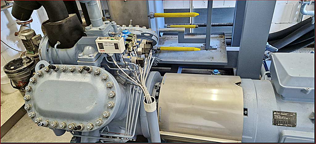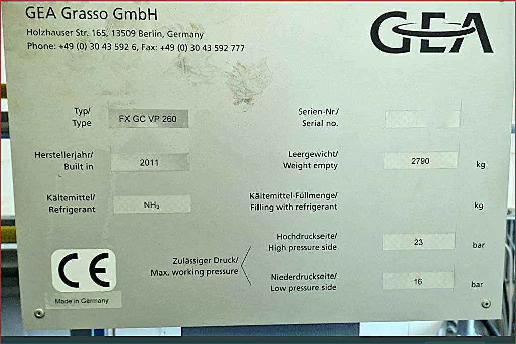 | Opis A compact ammonia refrigeration system GEA with evaporative condenser and pump-operated plate evaporator is available. Design: split design, refrigeration capacity: 247kW, compressor speed: 1450rpm, evaporation temperature: 0.7°C, condenser capacity: 300kW, wet-bulb temperature: 21°C, max. condensing temperature: 35°C, refrigerant: NH3, max. operating pressure high pressure/low pressure: 23bar/16bar. Secondary refrigerant: electrolysis water, secondary refrigerant temperature inlet/outlet: 6°C/2°C, secondary refrigerant volume flow: 54m³/h, secondary refrigerant pressure drop: 53kPa, refrigerant charge: 50kg, oil charge: 20l, compressor: Grasso 410. Machine dimensions X/Y/Z: approx. 4300mm/2000mm/2800mm, weight: approx. 6500kg. Documentation available. An on-site inspection is possible. |