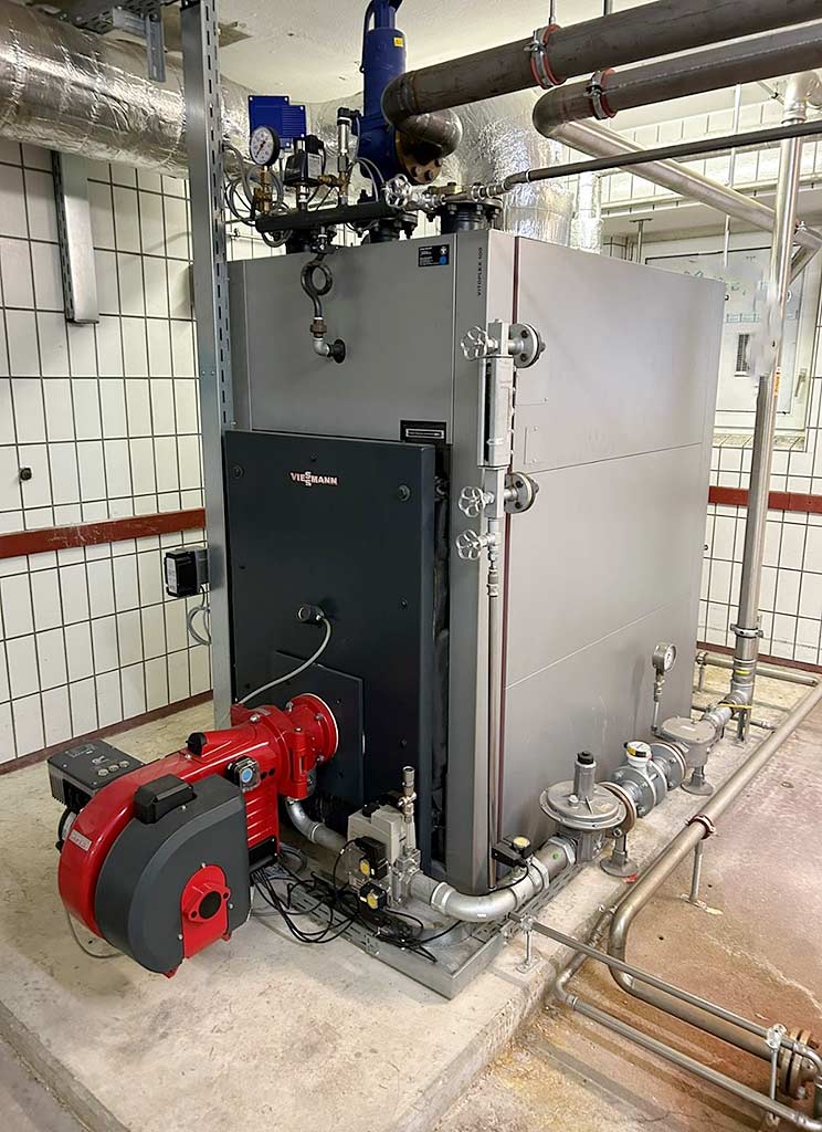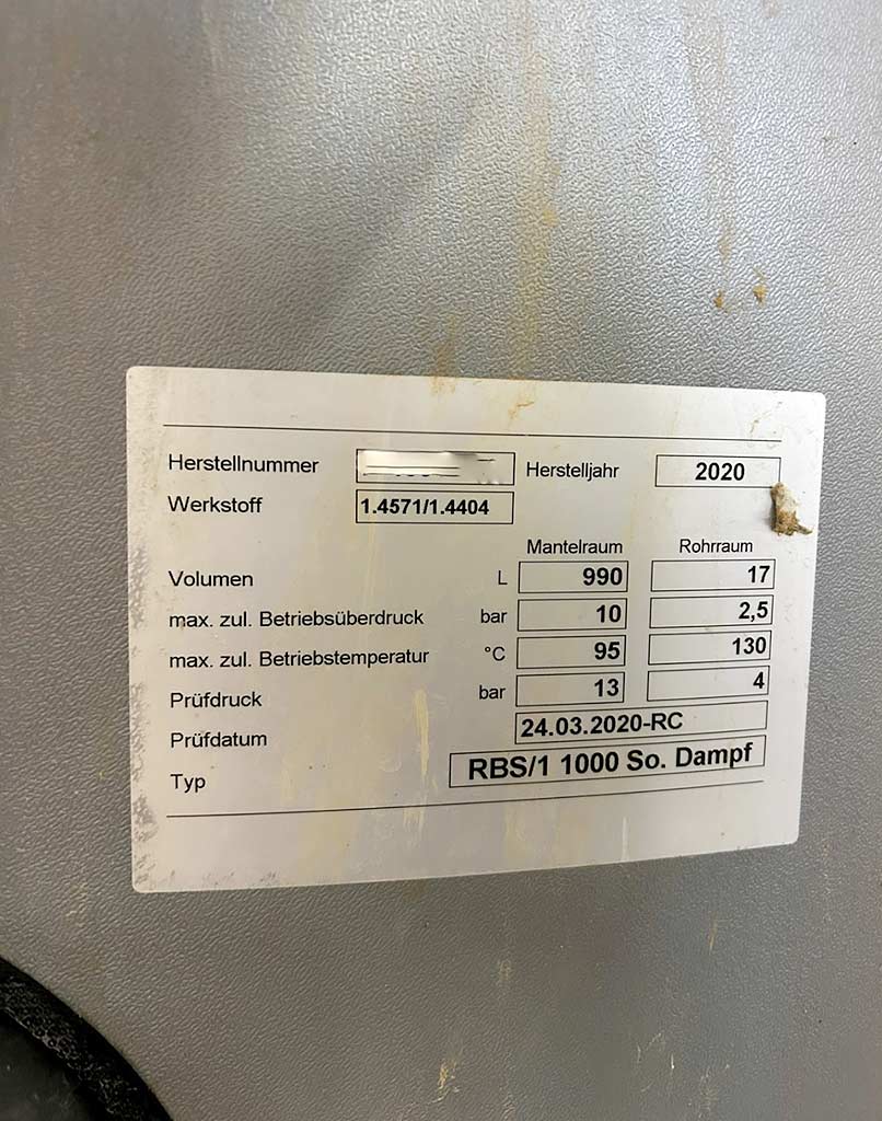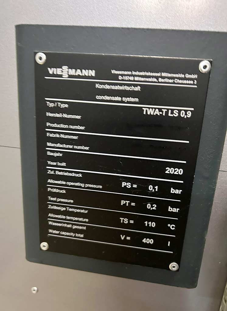| Opis A complete low-pressure steam boiler system Viessmann is available. 1) Condensate unit Viessmann TWA-T LS 0,9, max. operating pressure: 0.1bar, test pressure: 0.2bar, max. temperature: 110°C, water volume: 400l. 2) Dosing system Schweizer-Chemie EMP 2.5l E60. 3) Steam generator Viessmann Vitoplex 100-LS, year of manufacture: 2019, nominal heat output: 460kW, steam capacity: 700kg/h, water volume: 960l, operating pressure: 1bar, test pressure: 4.8bar. 4) Control cabinet Viessmann Vitocontrol HS. 5) Steam accumulator/pressure vessel Viessmann RBS/1 1000 So. steam, volume shell space/tube space: 990l/17l, max. operating overpressure shell space/tube space: 10bar/2.5bar, max. operating temperature shell space/tube space: 95°C/130°C, test pressure shell space/tube space: 13bar/4bar. Documentation available. An on-site inspection is possible. |