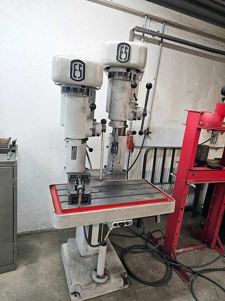 A pillar drilling machine in double column design Ecker und Schmidt is available. Number of spindles: 2, drilling capacity in steel: 23mm, throat depth: 330mm, drilling stroke: 120mm, max. workpiece height: 750mm, spindle taper: MK1, column diameter: 130mm, table dimensions X/Y: 760mm/360mm. Machine dimensions X/Y/Z: approx. 1100mm/1150mm/2100mm, weight: approx. 700kg. On site inspection is possible.
