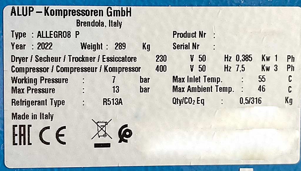 | Opis Two ALUP compressors including two heat exchangers are available. Operating pressure: 7bar, max. pressure: 13bar, max. inlet temperature: 55°C, power range: 11kW-30kW, refrigerant: R513A, refrigerant quantity: 500g, weight: approx. 290kg. Documentation available. An on site inspection is possible. |