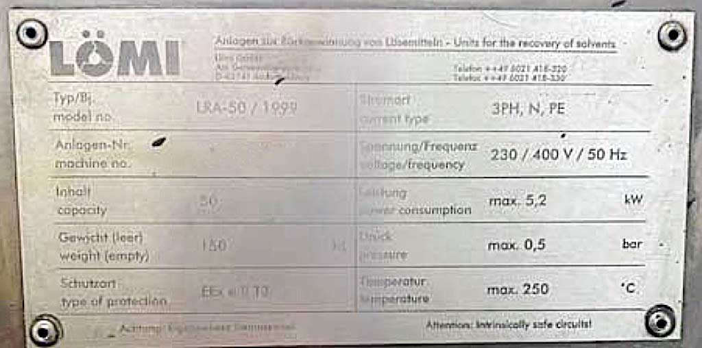| Opis An untested vacuum distillation unit/solvent recycling unit Lömi for the recovery of organic solvents is available. Volume: 50l, operating volume: 30l, distillation capacity range: 8l-20l/h, max. operating temperature: 250°C, protection: EX, vacuum pump type: LÖ/V 6, max. vacuum pressure: 80mbar. Machine dimensions X/Y/Z: approx. 1450mm/600mm/1800mm, weight: approx. 300kg. An on-site inspection is possible. |
