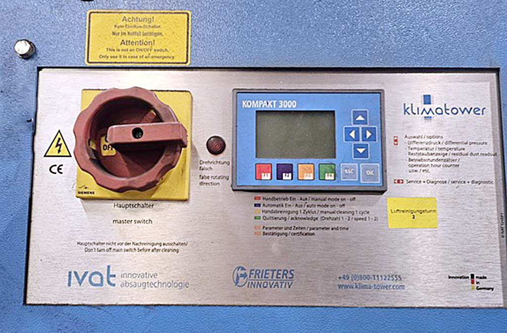 | Opis Two Ivat filter towers for dust and smoke with temperature control and nanofilter are available. Air volume flow: 22000-25000m³/h, motor power: 18.5kW, max. separation efficiency: 99.95%, filter area: 120m², filter cartridges: 4, machine dimensions X/Y/Z: approx. 2000mm/1500mm/3000mm, weight: approx. 1200kg. Documentation available. An on-site inspection is possible. |