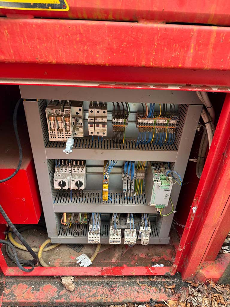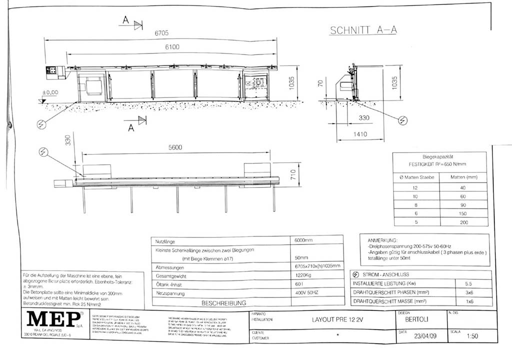 Working height: 1035mm, usable width: 6000mm, max. usable length: 6000mm, max. wire diameter: 12mm, max. tensile strength: 650N/mm², bending capacity (number of bars): Ø12mm: 40 bars, Ø10mm: 60 bars, Ø8mm: 90 bars, Ø6mm: 150 bars, Ø5mm: 200 bars, geometry/bending data: smallest leg between two angles: 50mm (with bending finger Ø17mm), standard bending finger: no.60, Ø40mm, number of programmable bending angles: 20, memory positions: 100, speeds: first speed: 45°: max. 5.8s, 90°: max. 8.7s, 180°: max. 13.7s, second speed: 45°: max. 2.9s (complete cycle forward/backward), 90°: max. 4.4s (complete cycle forward/backward), 180°: max. 6.8s (complete cycle forward/backward), mechanics/hydraulics: 4 double-acting hydraulic cylinders, hydraulic unit with pumps, solenoid valves, pressure regulators, safety valves, delivery without oil, operation/control: control panel with keyboard and numeric display, manual and automatic operation, foot pedal control, emergency stop button and emergency stop foot pedal, installed power: 5.5kW, length: 6705mm, width: 710mm, height: 1035mm, weight: 1220kg, oil tank capacity: 60l, electrical connection: phases: 3x6mm², ground: 1x6mm², equipment: support frame with control cabinet and hydraulic unit, fixed and movable bending bar, standard spare parts set, foot pedal (1x) + emergency stop foot pedal (1x), documentation available, on-site inspection is possible.