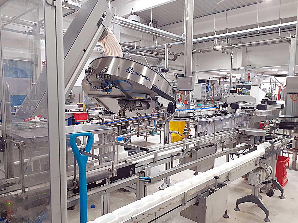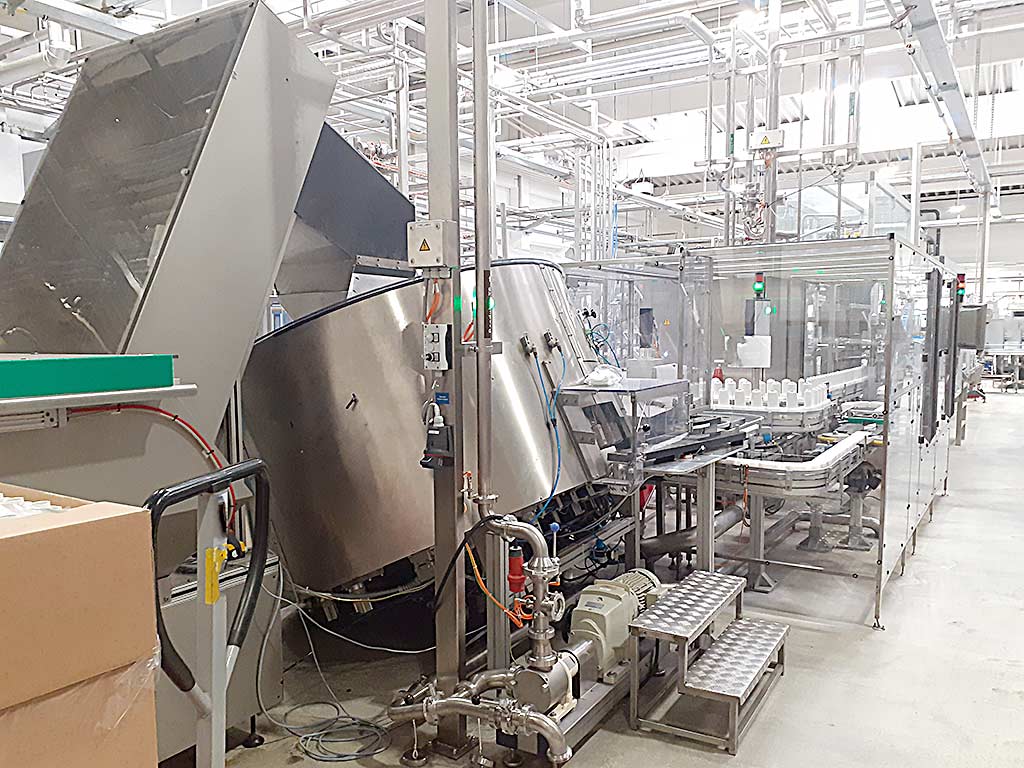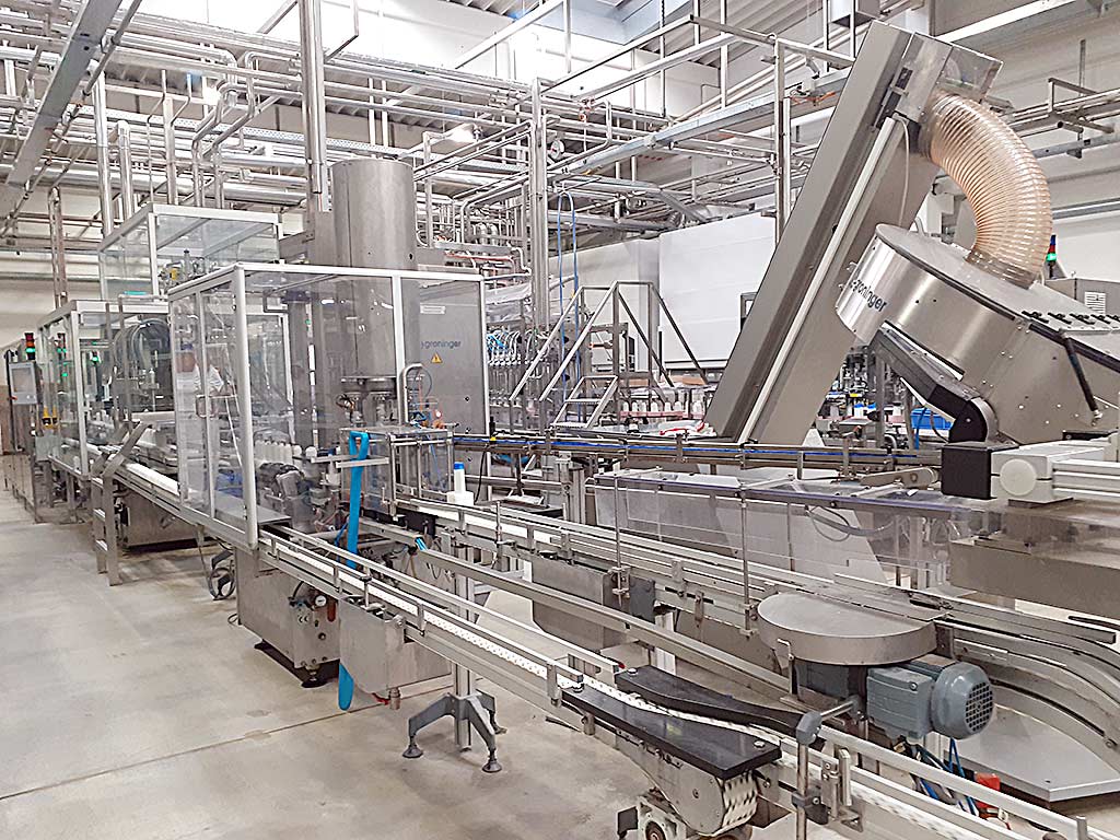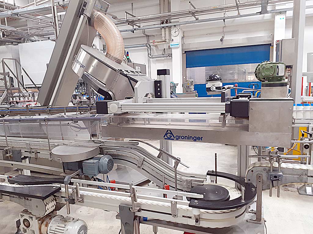 | Opis A complete Groninger bottle filling line is available. 1) Bottle unscrambler Groninger ZSB 2000, year of manufacture: 1995. 2) Filling machine Groninger DFV 1000Q, year of manufacture: 2013, filling stations: 10, additional function: transverse transfer system, output: approx. 9000/h, dosing range: 5ml-1000ml, container height range: 30mm-250mm, transport cup dimensions X/Y: 108mm/80mm, operating hours: approx. 24100h. 3) Cap sorter Groninger ZSK 1500, year of manufacture: 1995, sorting disc speed: 25rpm. 4) Capping machine Groninger KVK 106, year of manufacture: 1995, max. capping output: 9000/min, max. container diameter: 100mm, max. container height: 200mm, machine dimensions X/Y/Z: approx. 3400mm/1450mm/2550mm, weight: approx. 1500kg. 5) Discharge conveyor Groninger, year of manufacture: 1995. Documentation available. An on-site inspection is possible. |