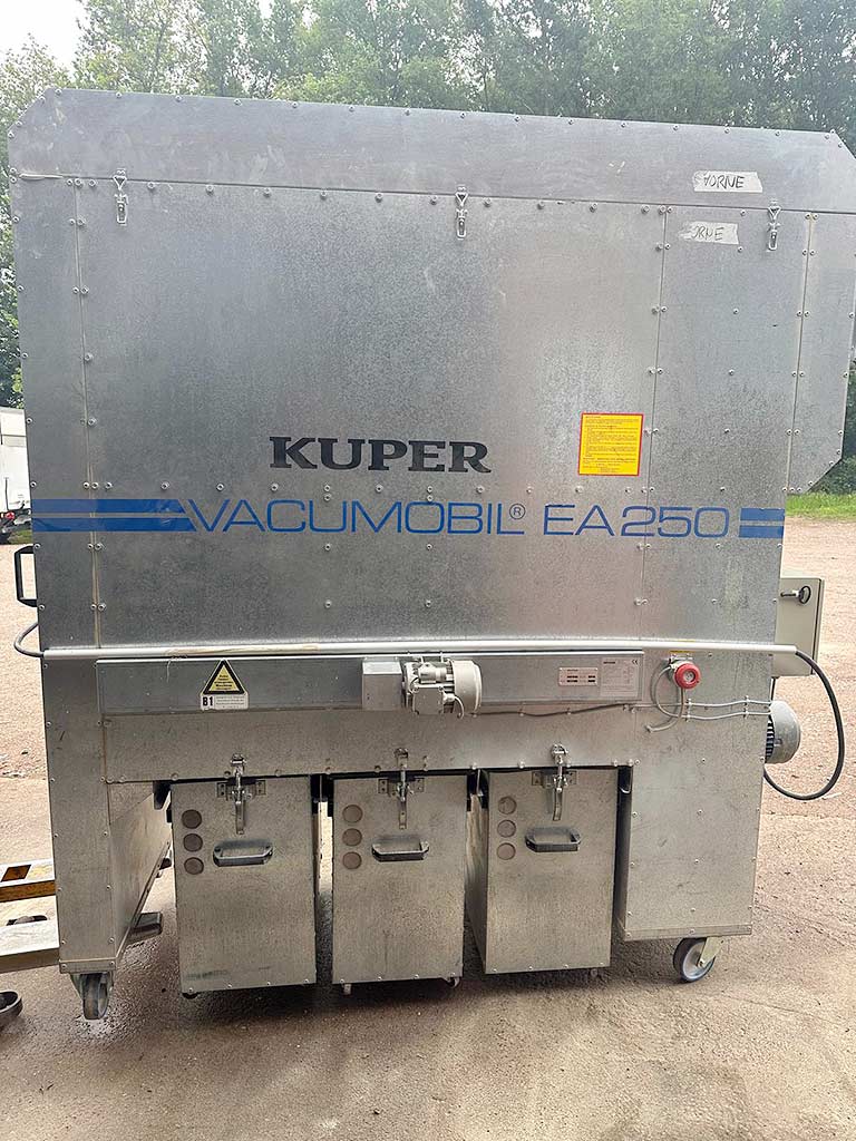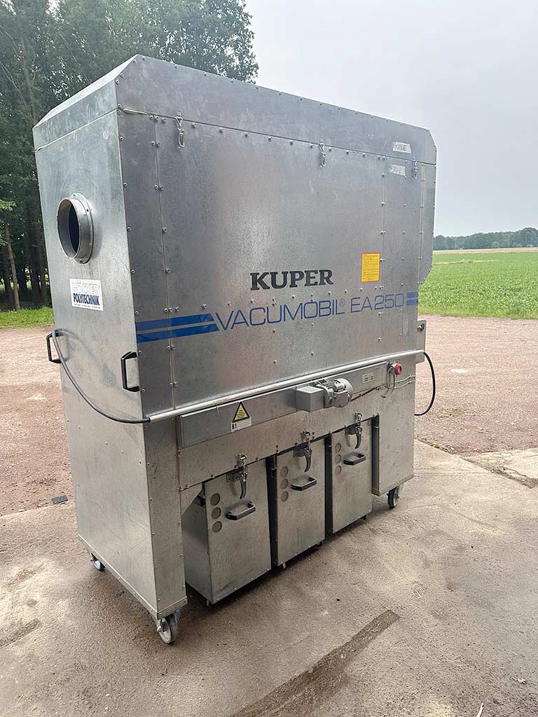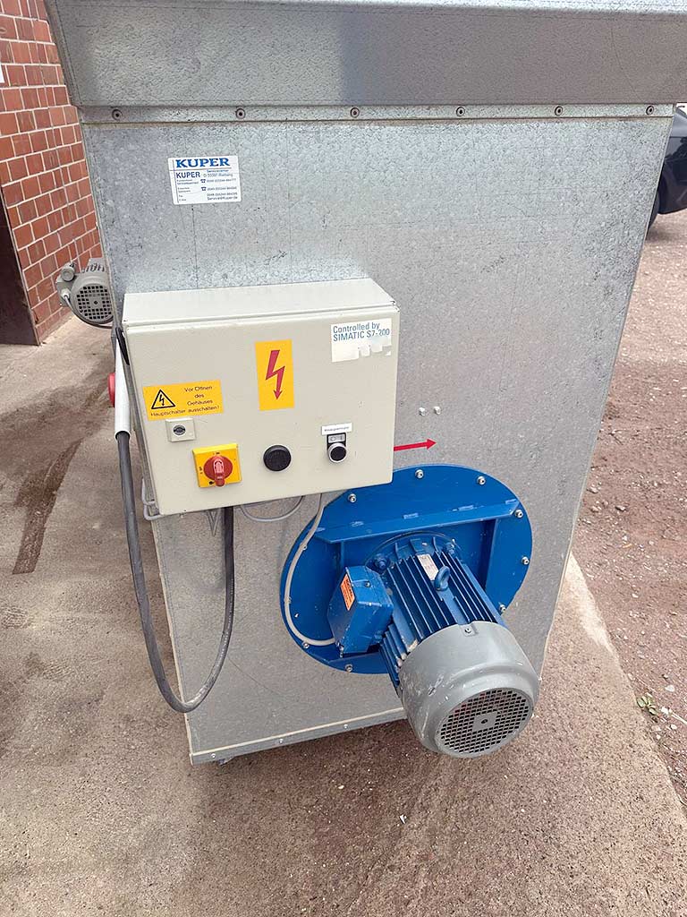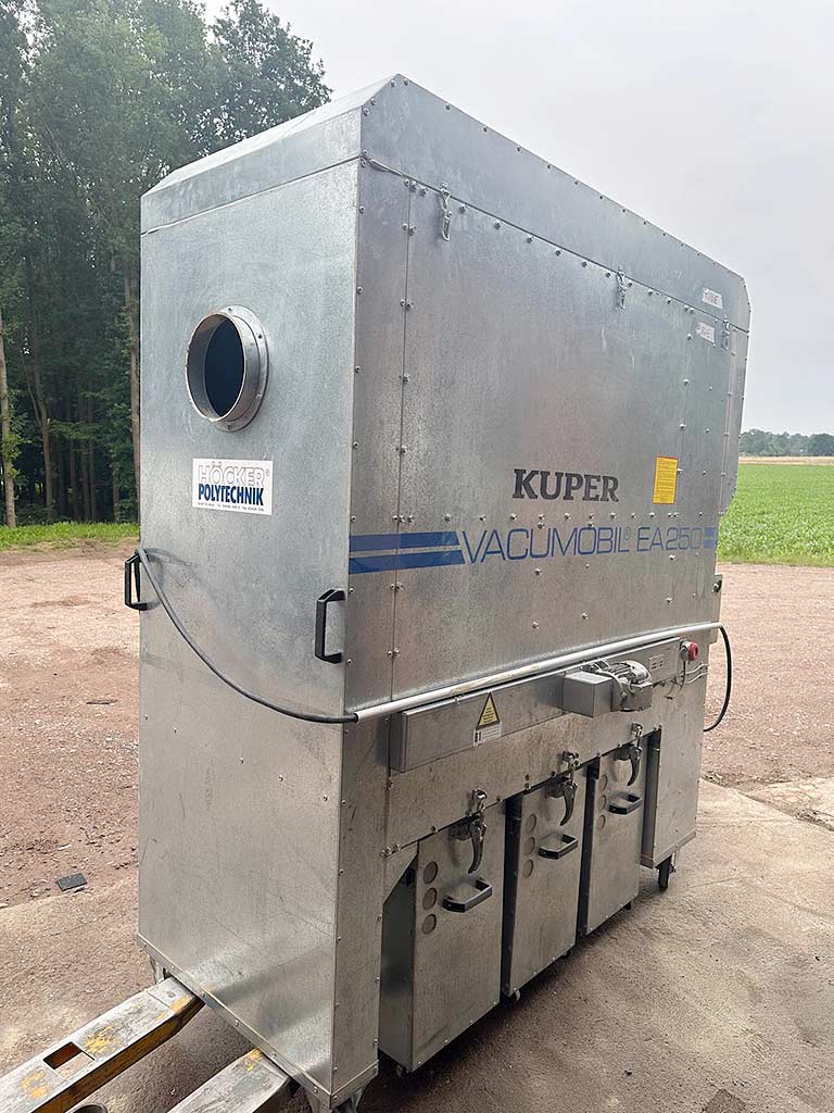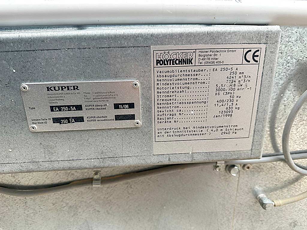 An industrial vacuum dust collector Höcker is available. Suction diameter: 250mm, nominal volume flow: 4241m³/h, min. volume flow: 3534m³/h, motor power: 5.5kW, vacuum pressure: 2940Pa, weight: approx. 630kg. Documentation available. An on-site inspection is possible.