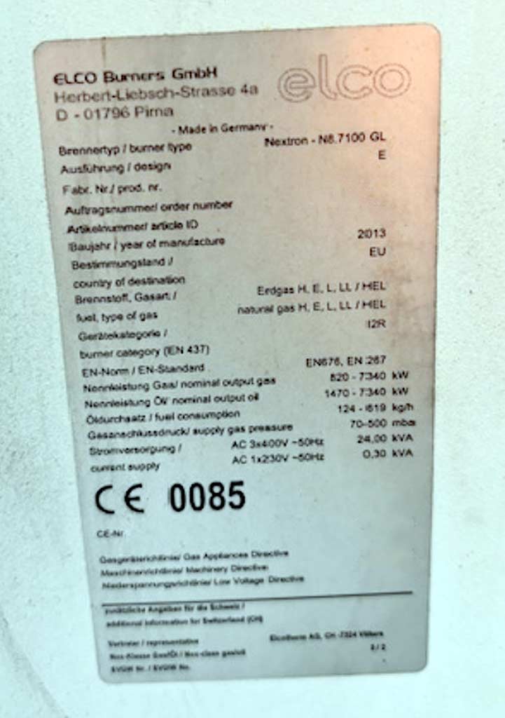 | Opis A monoblock high-performance dual-fuel burner Elco is available. Nominal output range (gas): 820kW-7340kW, nominal output range (oil): 1470kW-7340kW, gas connection pressure range: 70mbar-500mbar, fan power: 15kW, burner tube outer diameter: 415mm, machine dimensions X/Y/Z: approx. 2700mm/1450mm/1250mm. Documentation available. An on-site inspection is possible. |